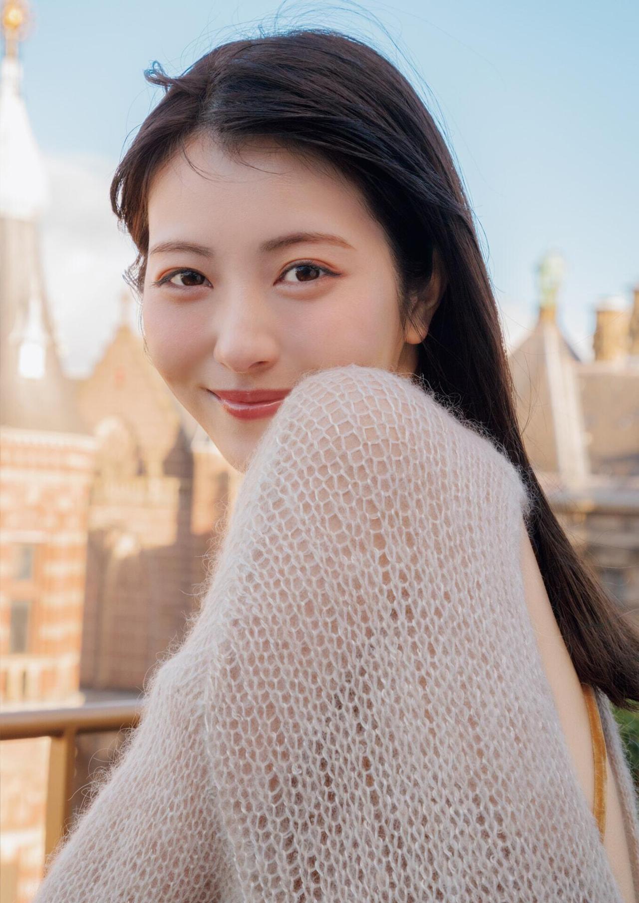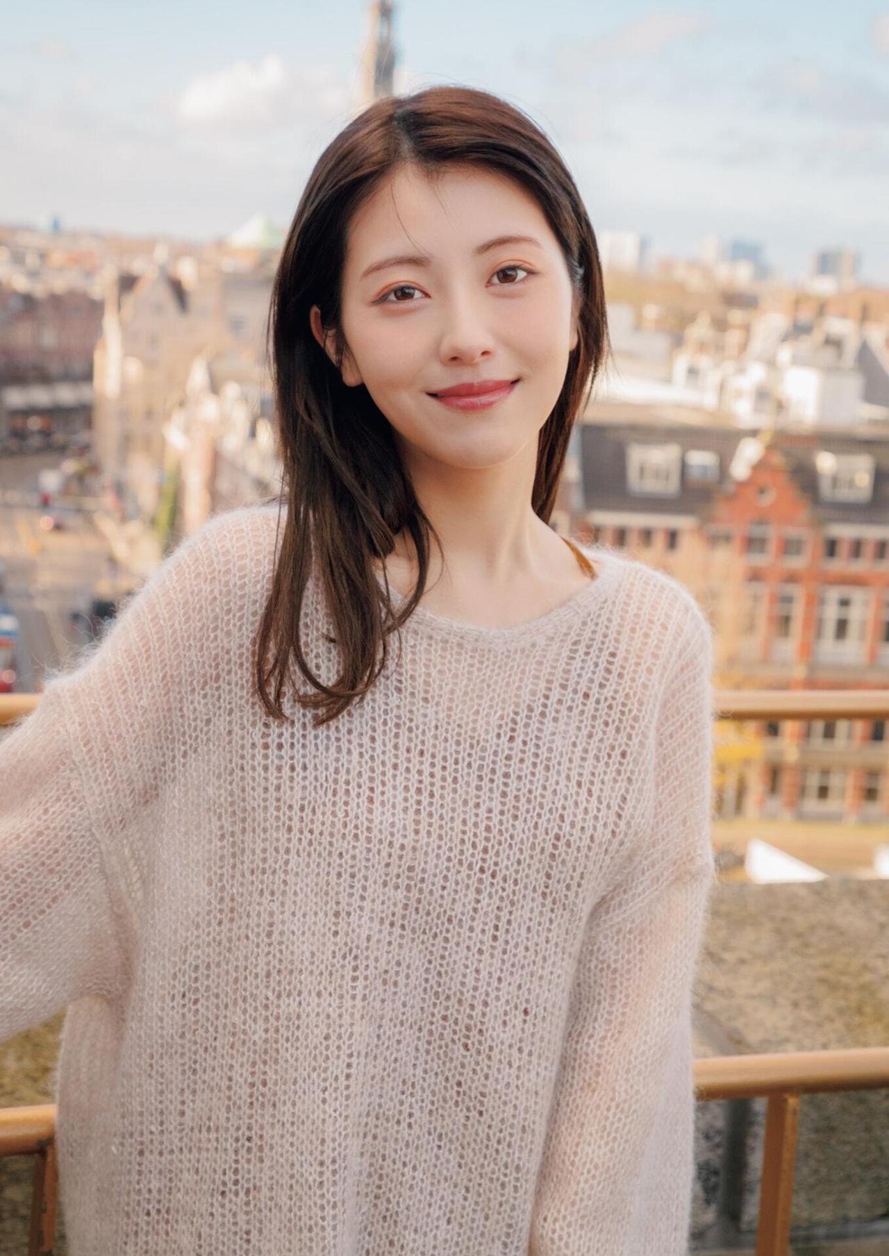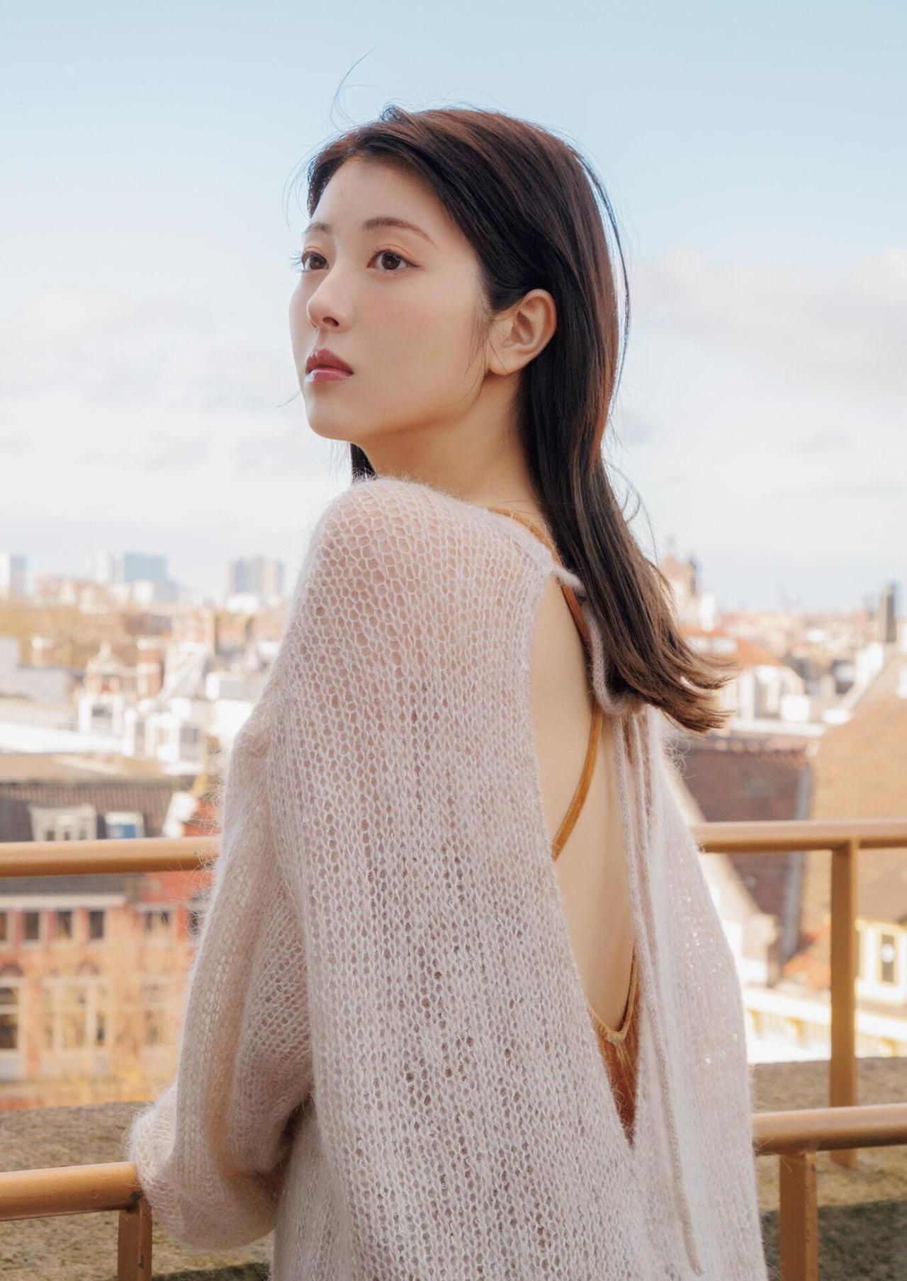 城市天际线下的温柔侧颜,轻纱飘逸,静谧如诗。