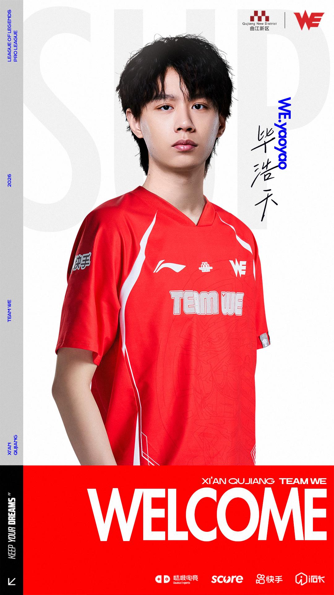 经过双方友好协商,我们非常高兴地向大家宣布,即日起,yaoyao(毕浩天)正式加入西安曲江WE电子竞技俱乐部,担任英雄联盟分部辅助位置选手。