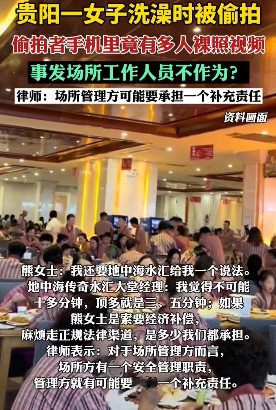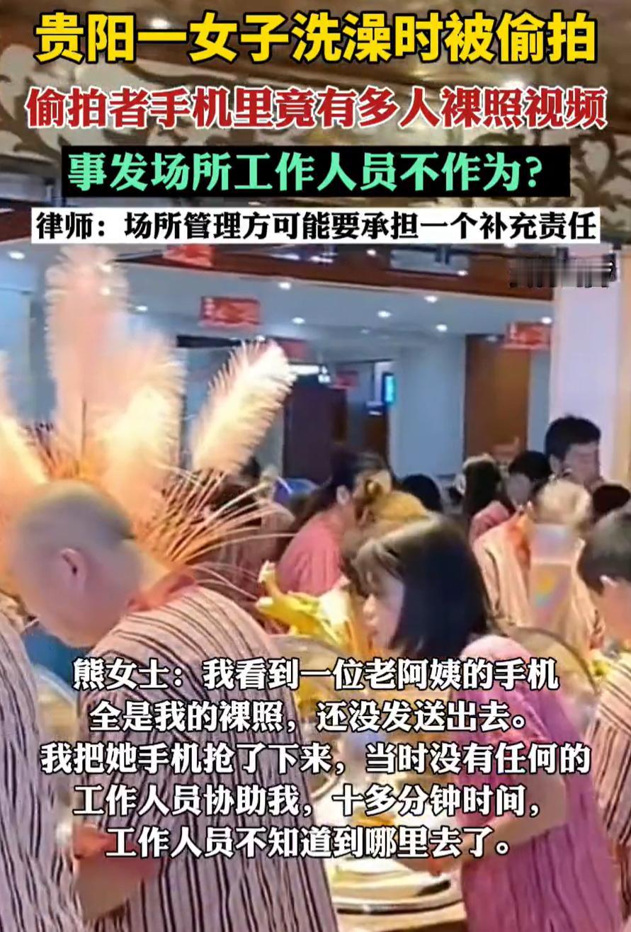 贵阳,女子去洗浴中心洗澡放松,没想到,期间一转头,突然发现一位大妈正用手机对着她拍摄,女子连忙上前夺过手机,发现她拍完照片正准备对外发送,事后大妈被拘留,但女子认为,洗浴中心责任也不小 熊女士介绍,当天她们一家四口去水汇洗澡放松,就看到一位年纪不小的大妈拿着手机对着她。那一瞬间,她整个人愣住,心里只剩一个念头,手机里会有什么 她冲上去把手机拿过来,里面全是她的照片,还有发送界面打开着,显然已经准备发给别人。现场僵了十几分钟,她一个人跟大妈拉扯、质疑、反复确认,可整个过程没有一位工作人员过来处理 这事报警后,调查发现大妈不止拍了她,还拍了其他人,还录了视频,甚至转发给朋友。最终,大妈被行拘七天。这个结局不意外,因为这种行为的性质很清楚 事情到这还没完。熊女士觉得,虽然拍她的人被处罚了,但水汇作为经营场所,管理上也有问题,洗澡区域本应私密,却让人随意拿手机拍摄,争执时也没人及时处理 她去找水汇讨说法,大堂经理回应说,并没有她说的“十几分钟没人管”,如果坚持要赔偿,可以走法律程序 其实我不觉得店家一定是故意放任,但这类场所如果缺乏巡查机制、缺乏人员干预意识,那就容易出问题。人来人往的地方,光靠客人自救,难免让人心生不安。不是要求店家替每个人盯着,只是想让他们在出现冲突或者异常的时候,能做到最起码的介入 说到底,这件事不只是一次偷拍和处理,更是一次提醒:公共场所的隐私安全,需要商家真正重视起来,而不是贴张“禁止拍摄”就了事