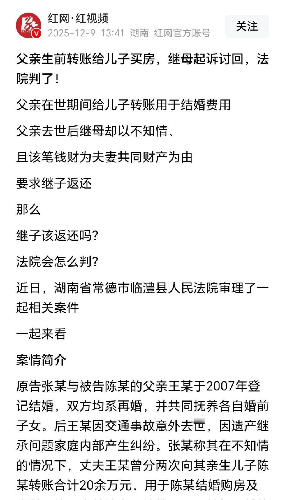 湖南常德,男子再婚后,和妻子约定各自抚养各自的婚前子女,日子过得还算平稳。可谁知好景不长,男子因交通事故意外去世,因遗产继承问题,儿子和继母闹的不可开交。继母一气之下把儿子告上法庭,声称男子生前给儿子转账20余万元,用于儿子的婚房购置和彩礼,这些她都不知情,侵害了他们的夫妻共同财产,请求继子退还。法院审理后,结果出乎继母的意料。 2007年,离异带娃的王某再婚娶了张女士,两人都是二婚,各自带着跟前任的孩子过日子。 为了减少不必要的矛盾,两人婚前就商量好,各自抚养自己的婚前子女,婚后互不干涉对方孩子的抚养事宜。 就这样,日子平平稳稳过了十几年,两人倒没闹过什么大矛盾。 王某心里一直记挂着亲生儿子陈某,看着儿子渐渐到了谈婚论嫁的年纪,买房、给彩礼都是不小的开销,他心疼儿子,想着多帮衬一把。 后来趁着手头宽裕,王某分两次给陈某转了总共20多万,也算是他这个父亲的一点心意,让儿子用来购置婚房、支付结婚彩礼。 陈某收下钱后,顺利办了婚事,一家人都挺高兴,殊不知,就是这样的父慈子孝,最后给陈某留下不小的隐患。 谁也没料到,安稳日子没过多久,王某就出了交通事故,意外离世。 料理完后事,家里就因为遗产继承的事吵翻了天,同属于第一顺位继承人的陈某和继母张女士,两个人开启了遗产争夺战,原本还算和睦的关系彻底闹僵。 争执中,张女士偶然得知王某生前给陈某转了20多万的事,瞬间气不打一处来。 她觉得这笔钱是自己和王某的夫妻共同财产,王某没跟她商量就擅自转给儿子,根本没把她放在眼里,这侵害了她的财产权益。 张女士越想越委屈,干脆一纸诉状把继子陈某告上了法庭,要求陈某把这20多万全额退回来,还称自己对这笔大额转账完全不知情。 收到法院传票,陈某傻眼了,亲生父亲给儿子转钱,帮衬他成婚,这是父亲的一片心意,怎么就不行了? 从来没听说过,哪个父亲帮忙给儿子买婚房、帮忙给彩礼,事后还要退回的,这不让人背后看笑话吗? 陈某也知道,父亲有稳定收入,这笔钱也没超出父亲的负担能力,他根本没做错什么,坚决不愿意退还。 法院开庭审理时,张女士一再强调王某擅自处分夫妻共同财产,自己毫不知情,希望法院认定这份赠与行为无效。 《民法典》第一千零六十二条第二款规定:夫妻对共同财产,有平等的处理权。 该条款明确夫妻对婚姻存续期间的共同财产享有平等占有、使用、收益及处分权利,非日常家事范畴的大额处分需双方协商一致,但并非所有单方处分行为均属无效。 本案中,王某转账的20余万元虽属其与张女士的夫妻共同财产,但其处分目的是帮衬亲生儿子陈某购置婚房、支付彩礼,属于父母对子女的合理帮扶,并非恶意转移财产或损害夫妻共同利益。 从客观事实来看,王某收入稳定,案涉款项未超出其经济负担能力,未对家庭共同财产造成实质性损耗,也未影响张女士的基本生活需求,其处分行为符合家庭伦理中父母扶持子女成家的普遍认知,未突破夫妻共同财产处分的合理性边界,不应简单认定为侵害张女士财产权益的无效行为。 同时,张女士主张对大额转账完全不知情,与二人共同生活十几年的实际情况不符,缺乏合理性。 另外,《民法典》第一百五十三条规定:违背公序良俗的民事法律行为无效。 王某与陈某系亲生父子,王某在陈某婚期节点转账帮扶,本质是履行父亲对子女的亲情照料义务,该赠与行为的目的正当、内容合法,完全契合公序良俗原则。 反观张女士主张赠与无效,其核心依据是王某单方处分共同财产,但无权处分并非民事法律行为无效的法定事由,且案涉赠与不存在违背夫妻忠实义务等无效情形。 陈某作为受赠人,有充分理由相信父亲的帮扶行为符合家庭共同意愿,主观上无过错,赠与合同自款项交付时即成立生效。 因此,法院认为,就算王某没跟张女士商量,但无权处分并不代表赠与合同无效,理应认定案涉赠与行为有效。 最终,法院依法判决:驳回了张女士的诉讼请求。 张女士不服这个结果,随后提起上诉,二审法院审理后,依旧维持了一审原判。