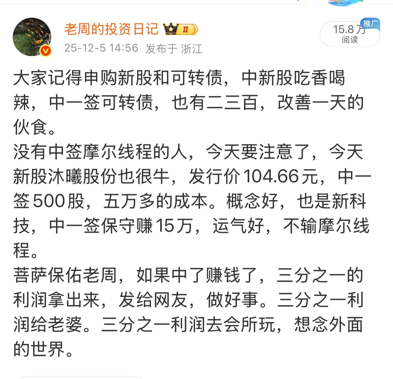 沐曦股份也没中,还想中了发5万红包给评论里的铁粉,可是没运气中签。今年运气不好,摩尔线程也没中。反正就是赚钱的股没中,今年中了个涨幅小的,就赚几千块钱。