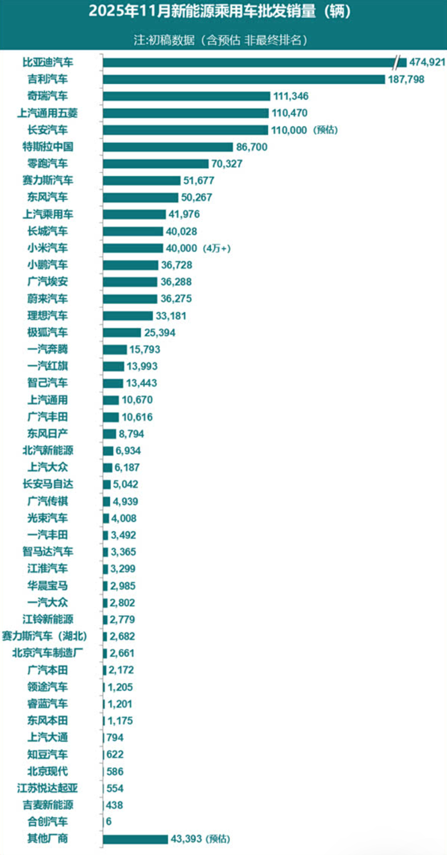 CleanTechnica+乘联会联合发布:11 月全球新能源乘用车销量榜单,特斯拉首次跌出前三,比亚迪、吉利、上汽包揽冠亚季军,这是新能源汽车发展史上首次出现前三名均为中国车企的情况。具体销量:比亚迪 486200 辆(同比增长42%)、吉利 312500 辆(含极氪、银河等子品牌,同比增 68%)、上汽 298700 辆(含智己、飞凡等品牌,同比增长55%);特斯拉 267300辆 (同比下滑 8%),小米汽车 42100 辆位列第七,SU7 自 2024 年 4 月交付以来累计销量超 32 万辆,成为全球最快达成30 万交付的新势力车型。排行榜比亚迪吉利特斯拉