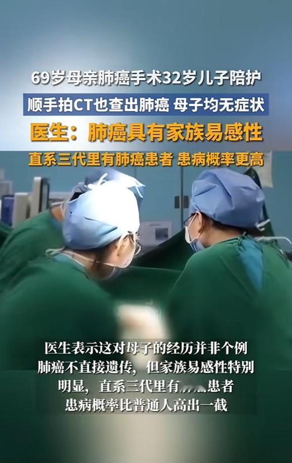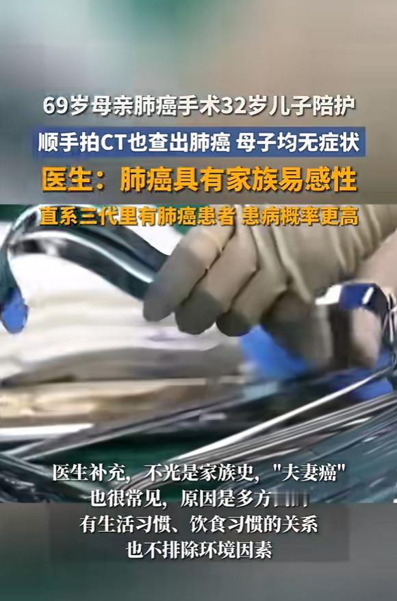 “太可怕了!”浙江宁波,一老人去体检,没想到竟查出肺癌,住院治疗后,32岁的儿子天天在医院陪护,顺便也做了个体检,发现竟然和母亲一样患了肺癌,令人疑惑的是,母子二人之前均没有不适症状,医生的解释令人意外! 宁波当地的一家三甲医院里,陈阿姨退休后一直坚持每年体检,今年的检查报告却给出了坏消息,胸部 CT 显示她的右肺有一个磨玻璃结节,进一步穿刺活检后,确诊为早期肺腺癌。 这个结果让全家人都慌了神,32 岁的小李立刻放下手头工作,每天在医院贴身陪护,帮着办理手续、照顾母亲的饮食起居。 看着母亲因为治疗日渐憔悴,小李心里很不是滋味,加上自己最近总觉得容易疲劳,在家人的劝说下,他也挂了个号,想着趁陪护的机会做个全面体检,图个安心。 谁也没料到,就是这个 “图安心” 的决定,查出了更让人崩溃的结果。小李的胸部 CT 报告显示,他的左肺上叶存在一个直径约 8 毫米的结节,病理检查后同样确诊为肺癌早期。 拿到报告的那一刻,小李整个人都懵了,自己年纪轻轻,不抽烟不喝酒,平时也没什么不良嗜好,怎么会和母亲一样患上肺癌。更让他疑惑的是,母子俩之前都没有出现过肺癌的典型症状,要是没有这次体检,恐怕还会一直被蒙在鼓里。 主治医生在详细了解情况后,给出的解释让一家人恍然大悟。医生表示,肺癌并非都会出现明显症状,像陈阿姨母子这样的早期肺癌患者,很多都没有咳嗽、咯血等表现,这也是为什么早期肺癌容易被忽视的原因。 而母子俩同时患病,并非简单的巧合,而是家族生活环境、生活习惯以及遗传易感性共同作用的结果。医生进一步解释,肺癌本身不会像流感那样传染,但长期生活在一起的家庭成员,若有共同的高危生活环境或习惯,患病风险会显著增加。 结合陈阿姨家的情况来看,家里的厨房通风条件一直不太好,陈阿姨做了一辈子饭,常年用中式爆炒、煎炸的方式烹饪,厨房油烟里的多环芳烃等有害物质,长期吸入会对肺部造成持续性损伤。 而小李虽然不常做饭,但从小在这样的环境中长大,日积月累也受到了影响。更关键的是,医生通过基因检测发现,母子俩都携带一种与 DNA 修复相关的基因变异,这种基因缺陷会让肺部细胞对致癌物的抵抗力更弱,患癌几率比普通人群高出 2 到 3 倍。 医生特别提醒,早期肺癌的预后相对较好,通过手术等规范治疗,5 年生存率能达到较高水平,陈阿姨母子因为发现及时,治疗效果很乐观。 这也给所有人提了个醒,定期体检尤其是胸部低剂量 CT 检查,是发现早期肺癌最有效的手段。很多人觉得自己身体好,没有不适就不用体检,却不知道肺癌的早期症状极其隐匿,等出现明显症状时,往往已经发展到中晚期,治疗难度和成本都会大幅增加。 对于有肺癌家族史、长期吸烟或接触油烟、粉尘等高危因素的人群,更要提高警惕,建议提前并缩短体检间隔。同时,改善生活环境也很重要,厨房要安装效果好的抽油烟机,烹饪时保持通风; 新房装修后要充分通风晾晒,避免有害物质残留;养成规律作息和健康的饮食习惯,适当运动增强免疫力。这些看似微小的细节,却能在很大程度上降低肺部疾病的发生风险。 陈阿姨母子的经历虽然让人揪心,但也因祸得福,通过体检及时发现了病情。他们的案例也让更多人意识到,肺癌离我们并不遥远,尤其是在有家族聚集倾向的情况下,更不能掉以轻心。重视体检、关注生活细节,才是预防肺癌最有效的方式。 对此,你们有什么看法,欢迎评论留言~
