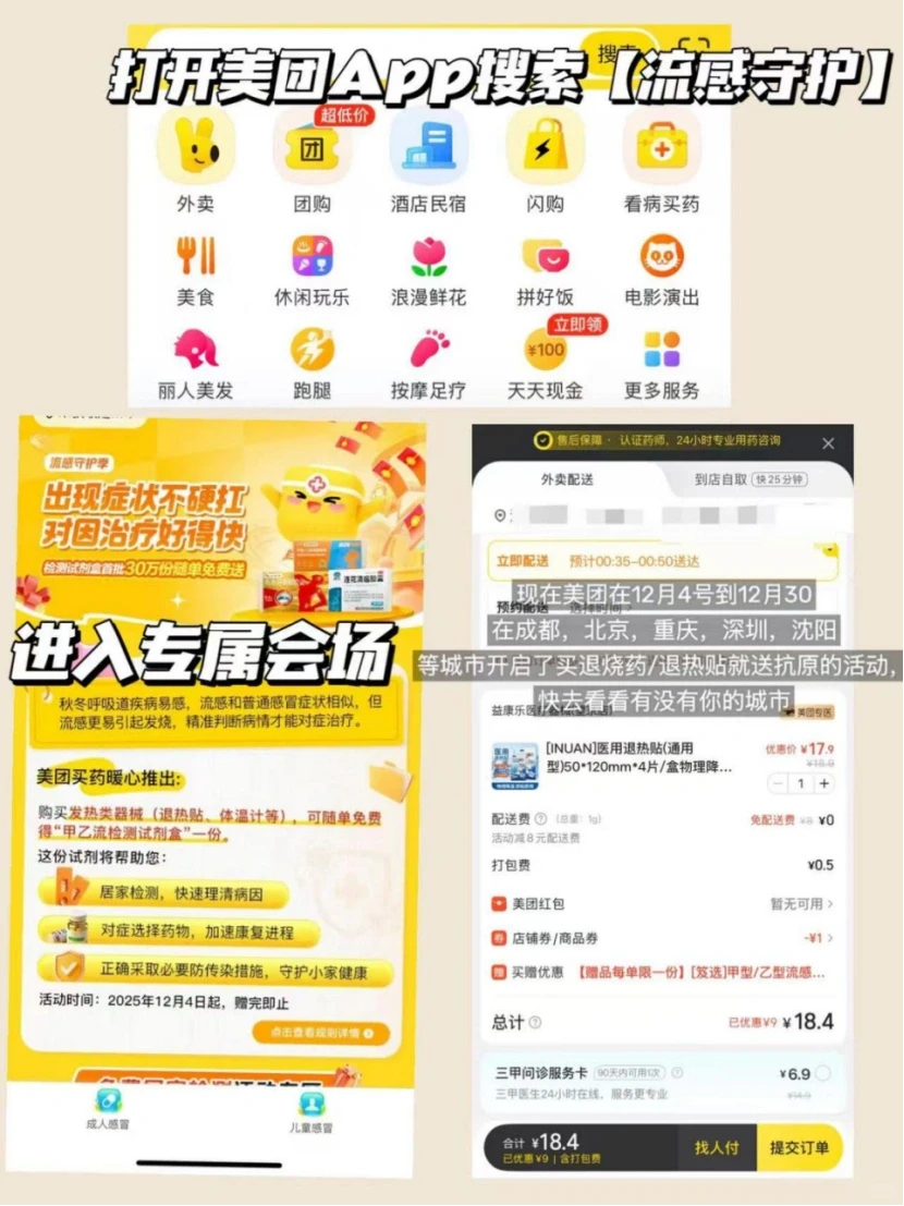 不用跑药店、不用请假!上美团App搜索【流感守护】,直达活动页就能买抗原试剂盒和特效药,24小时营业,平均30分钟送到家,宅家就能搞定,完全不耽误搬砖!