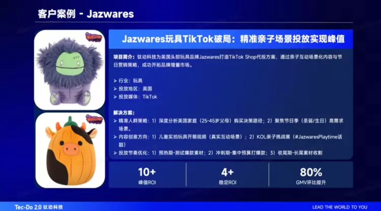 钛动科技作为全球领先的、以商业智能和技术驱动的一站式出海营销服务商,始终致力于以创新的全域增长解决方案,赋能品牌在全球市场实现商业成功。钛动科技与全球头部玩具品牌Jazwares在美国市场的成功合作,正是其深度理解行业、精准运用平台、以科技赋能创意的最佳实践,成功开辟了玩具品牌通过TikTokShop实现品效峰值的新路径。