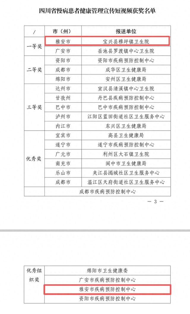近日,在四川省促进基本公共卫生服务均等化指导中心组织的以“体重管理,健康血压”为主题的慢病患者健康管理宣传短视频征集及遴选活动中,雅安市选送的视频作品从全省参赛的67个作品、20个市(州)中脱颖而出,荣获佳绩,其中,宝兴县穆坪镇卫生院创作的短视频作品荣获一等奖。同时,雅安市疾病预防控制中心因组织工作得力,报送作品质量整体优良,荣获“优秀组织奖”。