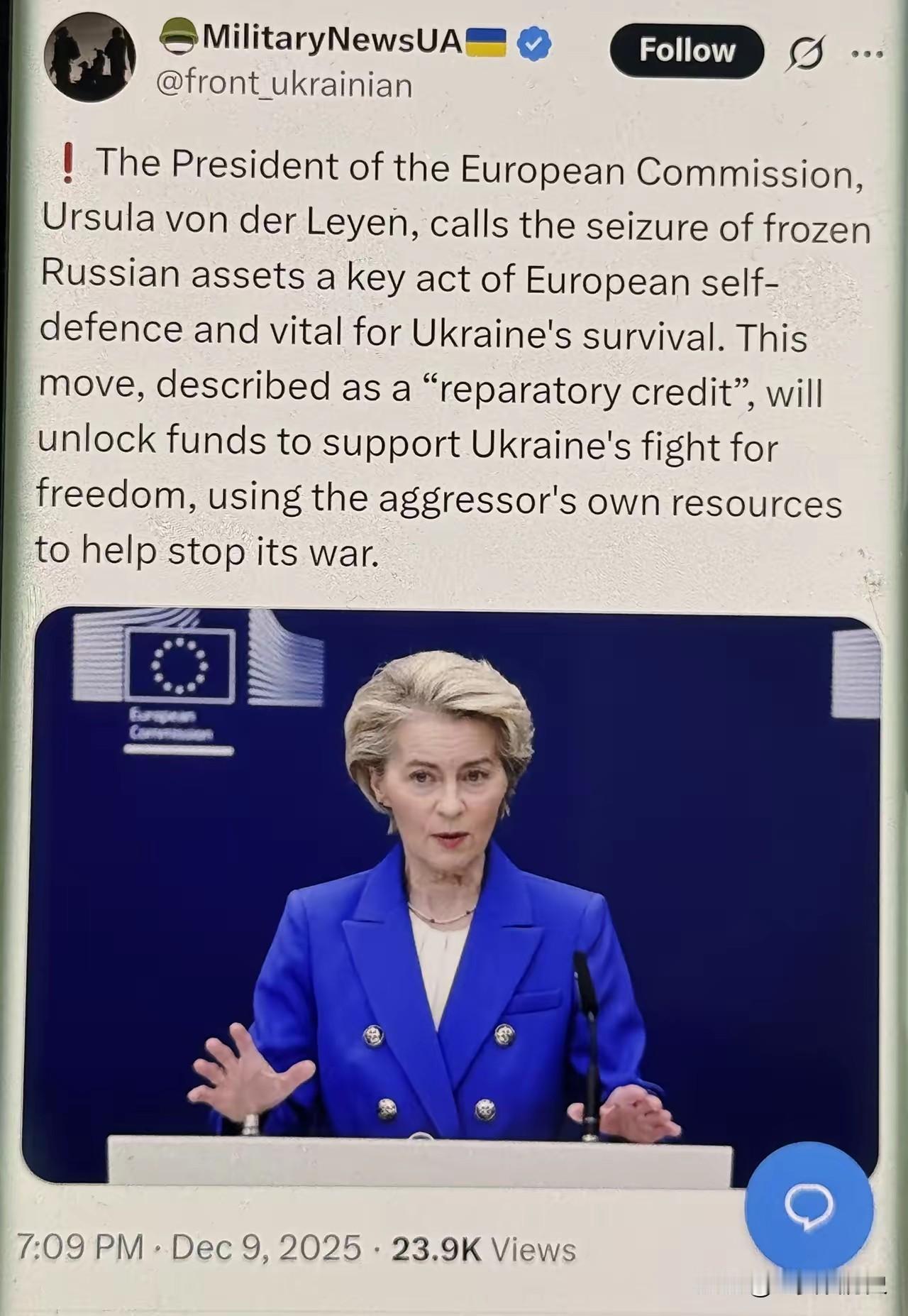 震惊!铁腕女人、欧盟委员会主席乌尔苏拉•冯德莱恩:冻结没收俄罗斯资产3000亿美元资产是“赔偿信贷”!她称:扣押被冻结的俄罗斯资产是欧洲自卫的关键行动,对乌克兰的生存至关重要。这一举措被称为“赔偿信贷”,将释放资金支持乌克兰为自由而战,利用侵略者自己的资源帮助其停止战争! 冯德莱恩这次是真急了。她直接把扣押俄罗斯资产这步棋,定义为“欧洲防御行为”。话里话外透着狠劲儿:“拖延援助不再是一种选择,这关系到乌克兰的生死存亡。” 战争拖得越久,对俄罗斯的代价就必须越高。可这雷霆手段的背后,更多是迫在眉睫的无奈。 乌克兰前线每一天都在烧钱。欧盟已提供了近1700亿欧元支持,但这台战争机器仍在嗷嗷待哺。美国援乌资金卡在国会,欧洲纳税人的钱袋也快见底了。那3000亿被冻结的俄罗斯资产,成了一座看得见却难动的“金山”。冯德莱恩现在想做的,就是把这金山产生的利息,变成给乌克兰的“赔偿贷款”。 想法够绝,可阻力如山。比利时第一个跳出来反对,首相德韦弗警告这计划“存在根本缺陷”,可能违反国际法,还会让比利时成为俄罗斯报复的靶子。日本也拒绝了欧盟的联合提议。欧盟内部更是分裂,七个东欧和北欧国家联名催促赶紧通过,可其他大国态度暧昧。钱怎么分、风险谁承担,吵得不可开交。 更深的矛盾在于,这到底是“正义的惩罚”,还是“危险的抢劫”?俄罗斯怒斥这是“盗窃”。国际法对此没有先例,一旦开了这个口子,全球金融体系的信任基石都会被动摇。未来任何国家发生冲突,外国资产还安全吗?这个法律与道德的死结,冯德莱恩还没解开。 她的战略意图很清晰:用俄罗斯的钱,给乌克兰续命;用强硬姿态,向美国证明欧洲的“可靠”;用这项行动,维系欧洲正在消磨的团结。她强调,这场战争没有分裂欧洲,反而让欧盟“更强大、更坚定”。 但风险同样巨大。如果操作不当,不仅会引发俄罗斯的猛烈反击,还可能让欧盟陷入漫长的法律诉讼,最终损害欧元信誉。这笔“赔偿信贷”,看似是给乌克兰的救命钱,实则也是欧盟为自己政治信誉和战略自主下的一笔高风险赌注。 战争打到这个份上,常规手段已然用尽。冯德莱恩举起这把“金融制裁之剑”,是绝望下的出击。它未必能立刻终结战争,却必将永久改变国际规则。未来的人们会评价,这是一个维护正义的创举,还是一个打开潘多拉魔盒的灾难。 各位读者你们怎么看?欢迎在评论区讨论。 欧盟 欧盟法令 欧盟资金