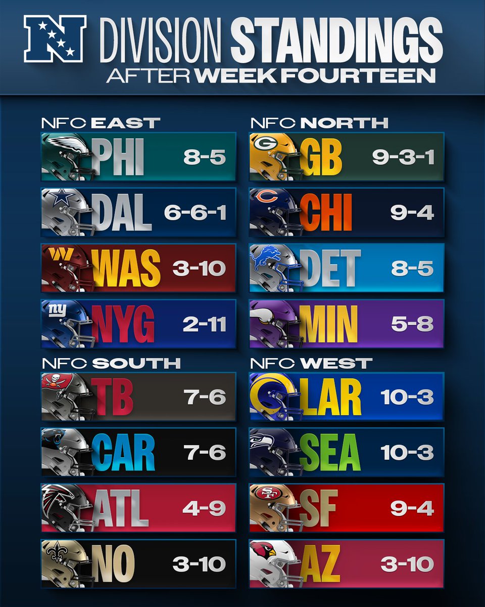 国联东区:费城老鹰,8胜5负;北区:绿湾包装工,9胜3负1平;南区:坦帕湾海盗,7胜6负;西区:洛杉矶公羊,10胜3负。