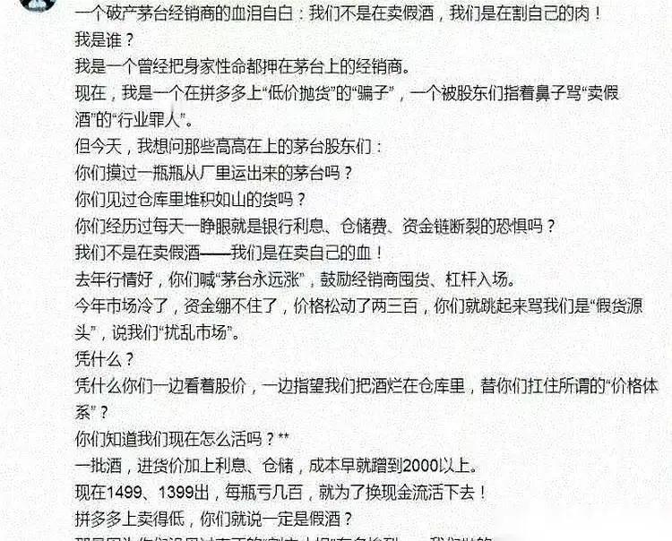 茅台一瓶干到3600的时候,没见一个经销商出来说自己发财了。一个个都捂得严严实实,生怕别人知道他家地窖里藏了多少“液体黄金”。 现在呢?刚跌破1400,全网都是他们哭爹喊娘的声音,说市场无情,说自己亏惨了,说这日子没法过了。 其实就是击鼓传花的金融游戏,玩家们心知肚明,只不过都是赌鼓锤永远不落,财富永恒不熄! 这种不创造价值的中间商,最好越少越好,不会被他们继续盘剥哦。 但凡开专卖店的,身家都得亿起步,今年预期盈利5000万,实际只赚1000万,他却直言亏了4000万。 哪个开专卖店的不是几亿以上的身家,预计今年赚5000万的结果赚了一千万,他说他亏了4千万。 生意有赔有赚,正常现象,赚钱不说,少赚就说赔钱。赔钱的是那些高价囤货的。