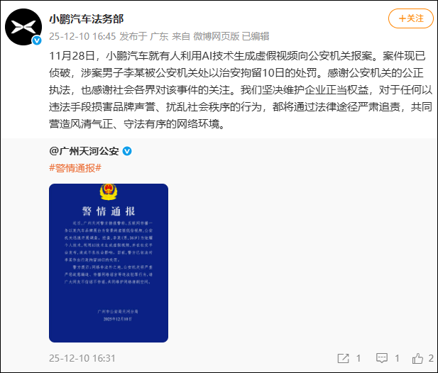 随后,@小鹏汽车法务部转发该通报,并表示:“11月28日,小鹏汽车就有人利用AI技术生成虚假视频向公安机关报案。案件现已侦破,涉案男子李某被公安机关处以治安拘留10日的处罚。”