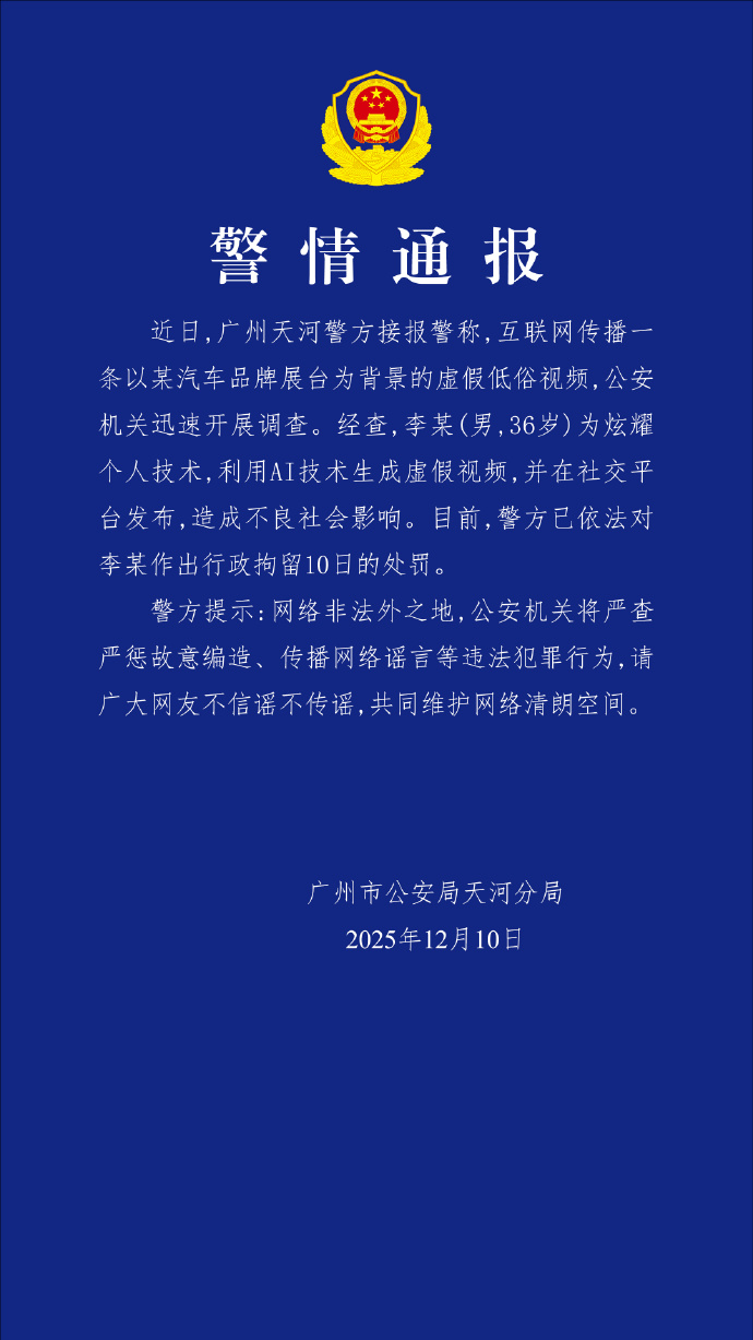 近日,广州天河警方接报警称,互联网传播一条以某汽车品牌展台为背景的虚假低俗视频,公安机关迅速开展调查。