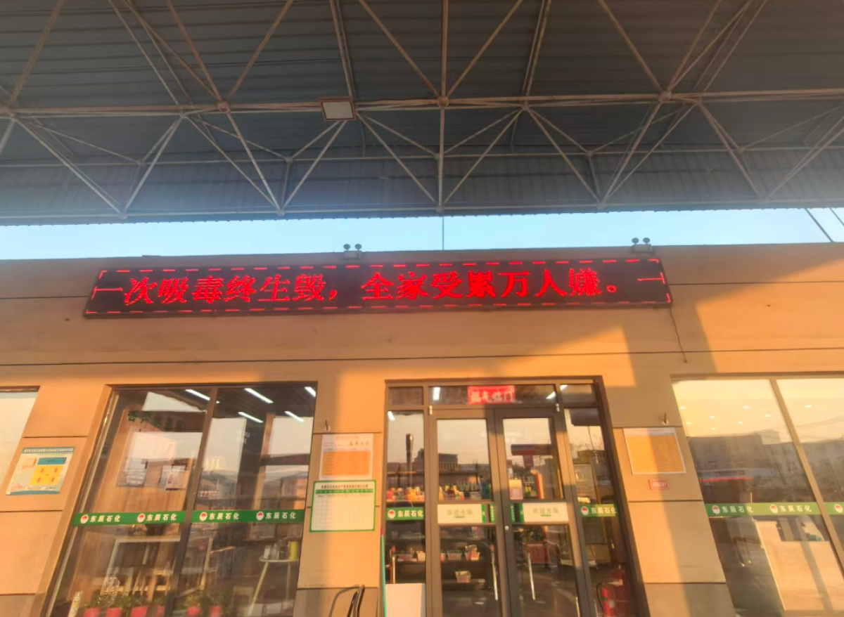 联动商超、宾馆、加油站等商贸流通企业,通过LED电子屏幕宣传禁毒知识标语,进一步延伸禁毒宣传覆盖面,引导群众知毒、防毒、拒毒,营造浓厚的禁毒氛围。
