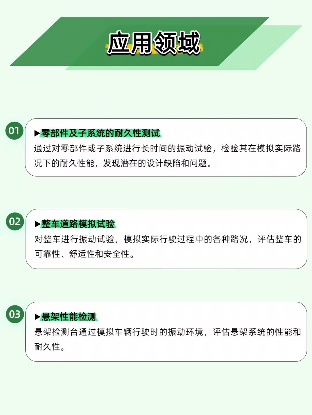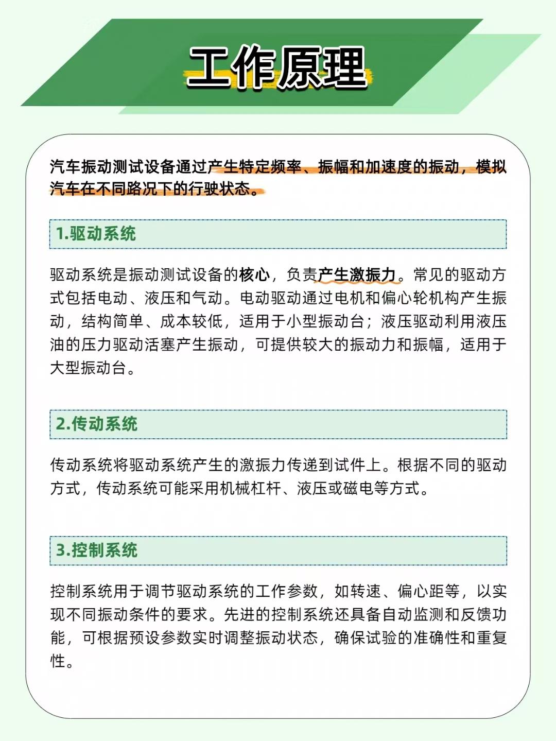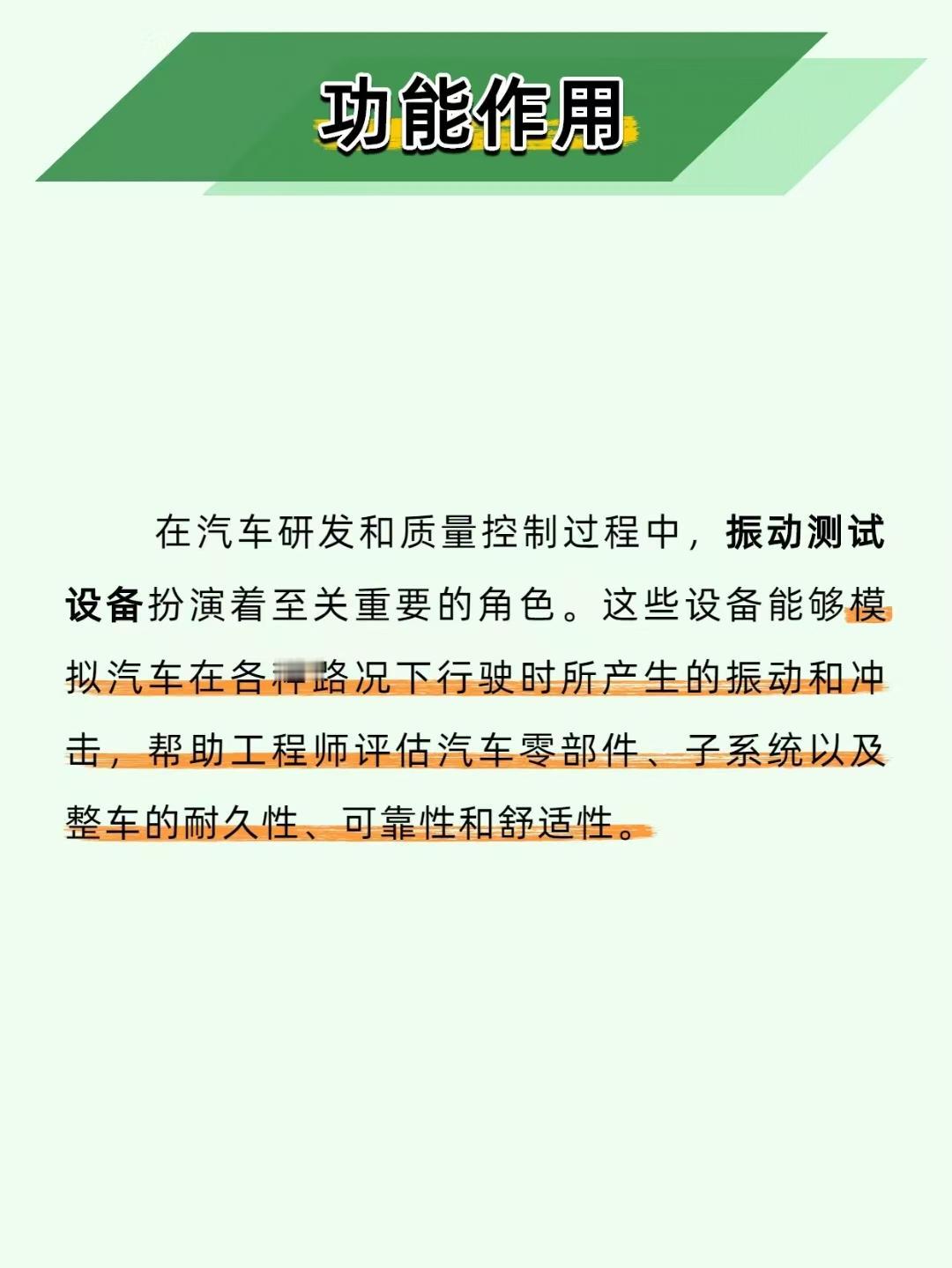 【你买的车耐不耐造,全靠这台 “暴力测试机”!】 你坐新车时没异响、跑烂路零件不松,不是运气好 —— 是汽车出厂前,被振动测试设备“虐” 过了! 这设备是车企的 “质量判官”:模拟烂路、颠簸、运输冲击,测零件 / 整车的耐用性、舒适性,提前揪出设计缺陷。 ————————————————————————————————— ✅ 它咋 “虐” 车? 靠 5 大系统配合: 驱动系统(电动 / 液压):产生振动冲击力; 传动系统:把振动传到零件 / 整车上; 控制系统:精准调频率 / 振幅,模拟不同路况; 测量系统:实时测振动数据; 分析系统:揪出哪里容易坏。 ————————————————————————————————— 📌 3 类常用设备: 电动振动台:测高频振动(比如高速颠簸),适合小零件; 液压振动台:测低频大冲击(比如过减速带),适合整车; 模拟运输振动台:测新车运输时会不会被颠坏。 ————————————————————————————————— 它管啥? 零件耐久:车门把手、座椅会不会晃松; 整车舒适:跑烂路时你坐得颠不颠; 悬架性能:悬架抗不抗造、滤震好不好。