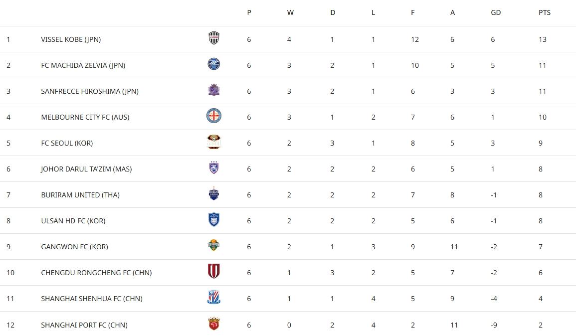 位列4-9名的球队分别是墨尔本城(10分)、FC首尔(9分)、柔佛新山(8分)、武里南联(8分)、蔚山HD(8分)、江原FC(7分)。