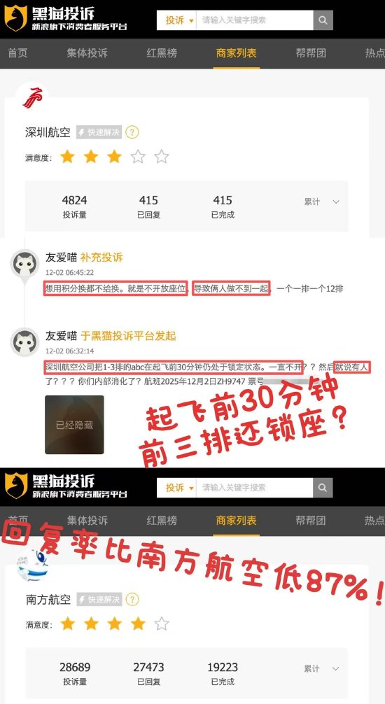 近期,有消费者向黑猫投诉反馈,自己乘坐的深圳航空航班起飞前30分钟1-3排abc座仍处于锁定状态一直不开并表示已有人,想用积分换取也不行就是不开放,导致同行两人坐不到一起。近期,越来越多消费者发现航司锁座问题并非偶然,可供选择的位置越来越少。截至目前,深圳航空在黑猫投诉平台投诉累计达4824单,回复率仅为8.6%,比南方航空低87%。