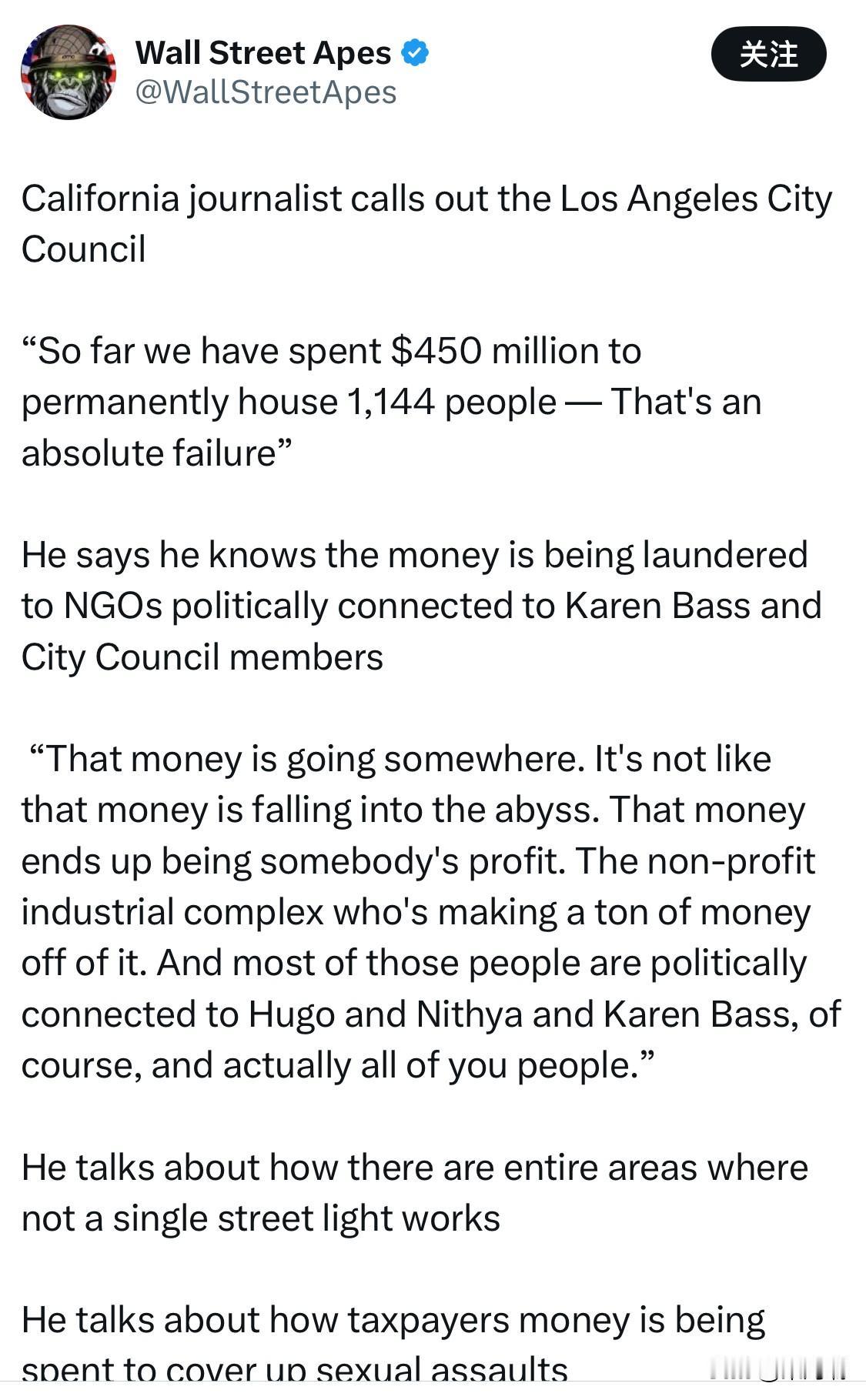 加州记者公开批评洛杉矶市议会 “到目前为止,我们已经花费了4.5亿美元来永久安置1144人——这完全是失败。” 他说他知道这笔钱正被洗白给与凯伦·巴斯和市议员有政治联系的非政府组织。 “这些钱是有去处的。它们不会就此消失。最终,这些钱会成为某些人的利润。那些非营利性产业集团从中赚取了巨额利润。当然,这些人中的大多数都与雨果、妮西娅、凯伦·巴斯,以及你们所有人,有着政治联系。” 他提到有些地区甚至连一盏路灯都不亮。 他谈到纳税人的钱是如何被用来掩盖性侵犯事件的。