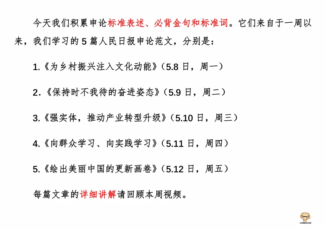 今天我们积累申论素材、必背金句和重点知识。它们来自于一周以来,我们学习的5篇人民日报申论范文,分别是: