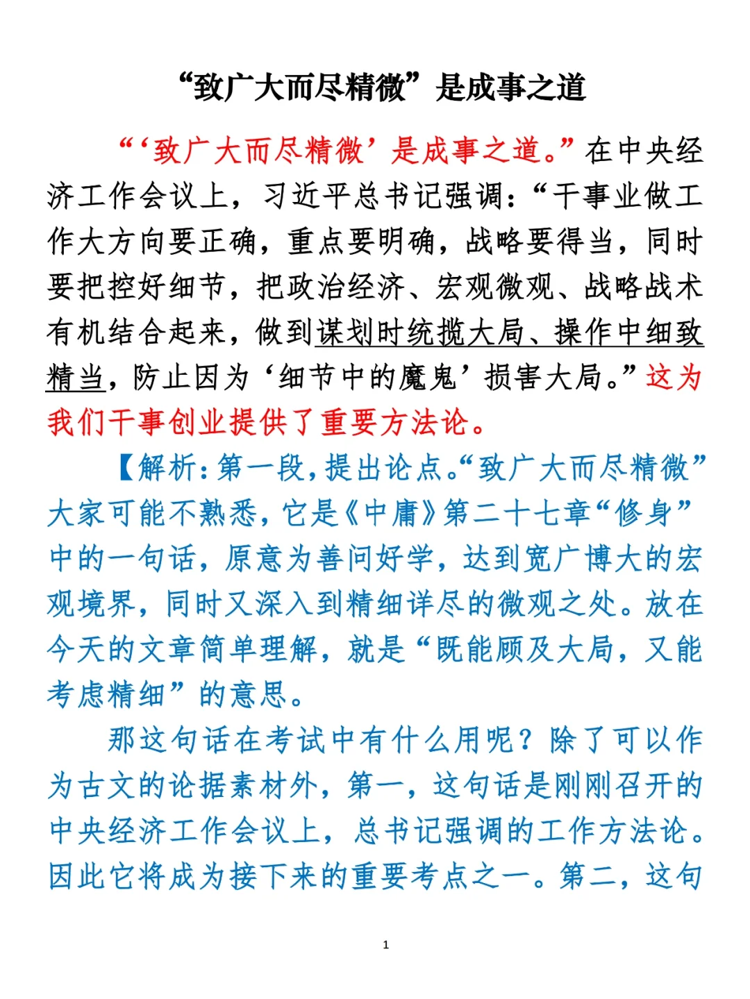中央经济工作会议是非常大的主题,如何学习?如何提取并掌握考点?我们需要找一些小切口,从不同角度抄写范文,研究重点,反复记忆。 今天,咱就先从“致广大而尽精微”这个重要工作方法论开始。