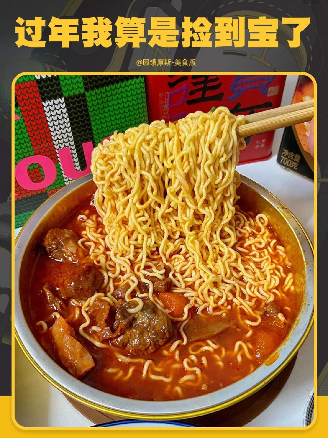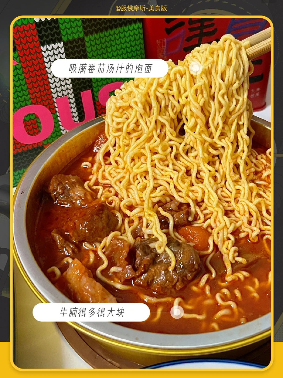泡面吸满番茄汁,满满的牛腩很大块,吃起来很爽。