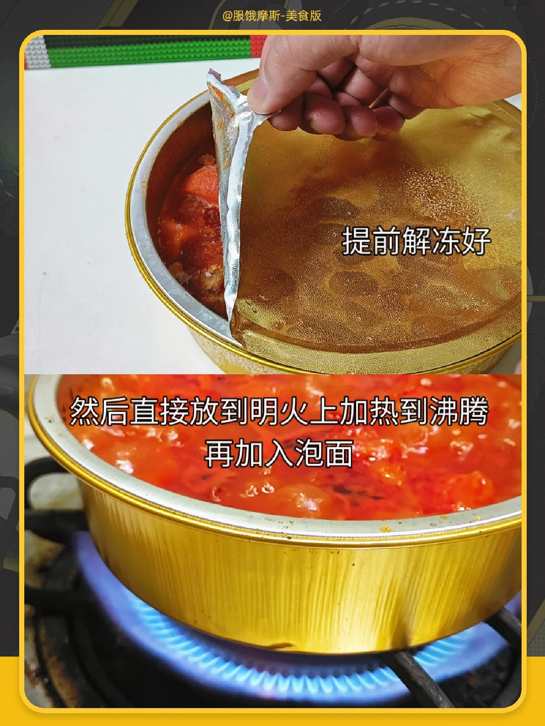 做法:番茄牛腩煲解冻后,撕开盖子,直接放到明火上煮至沸腾加入泡面。