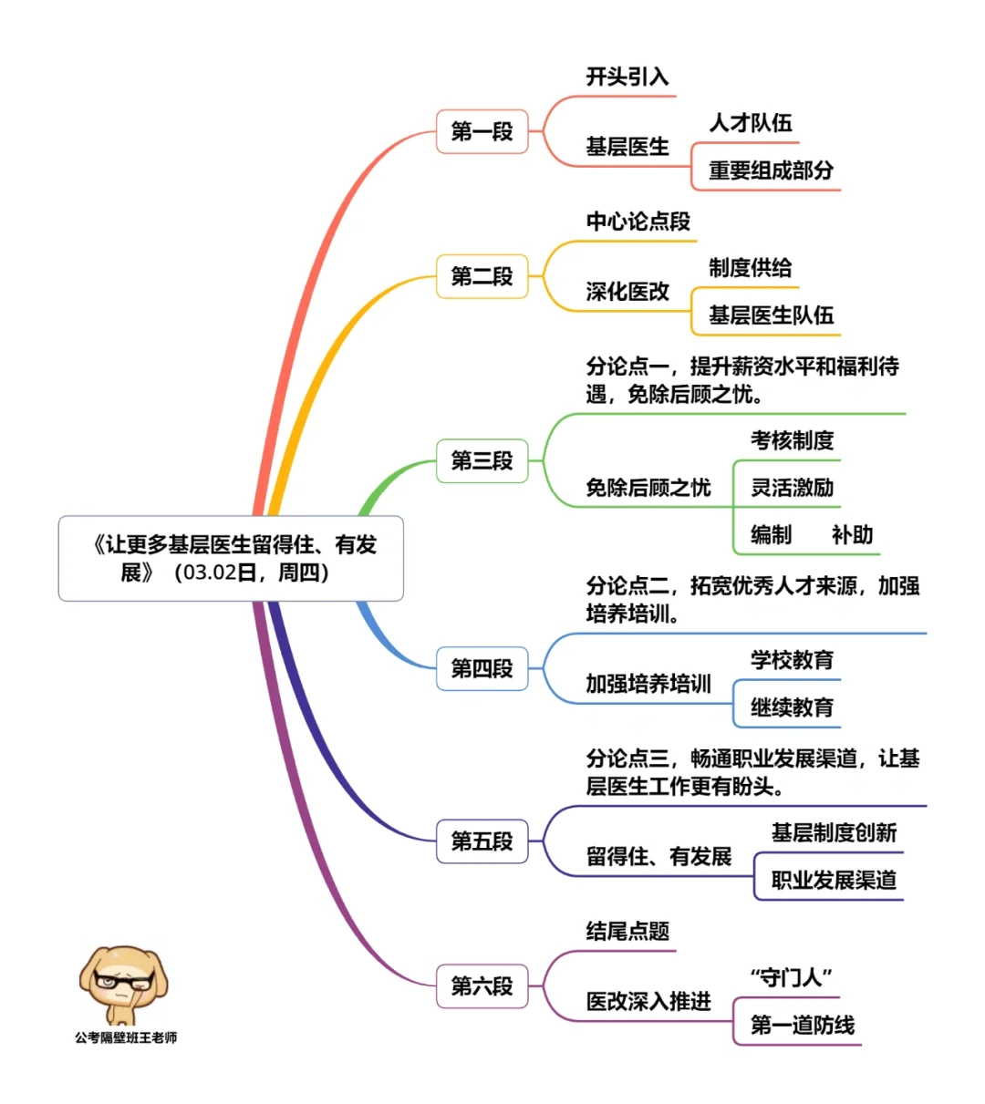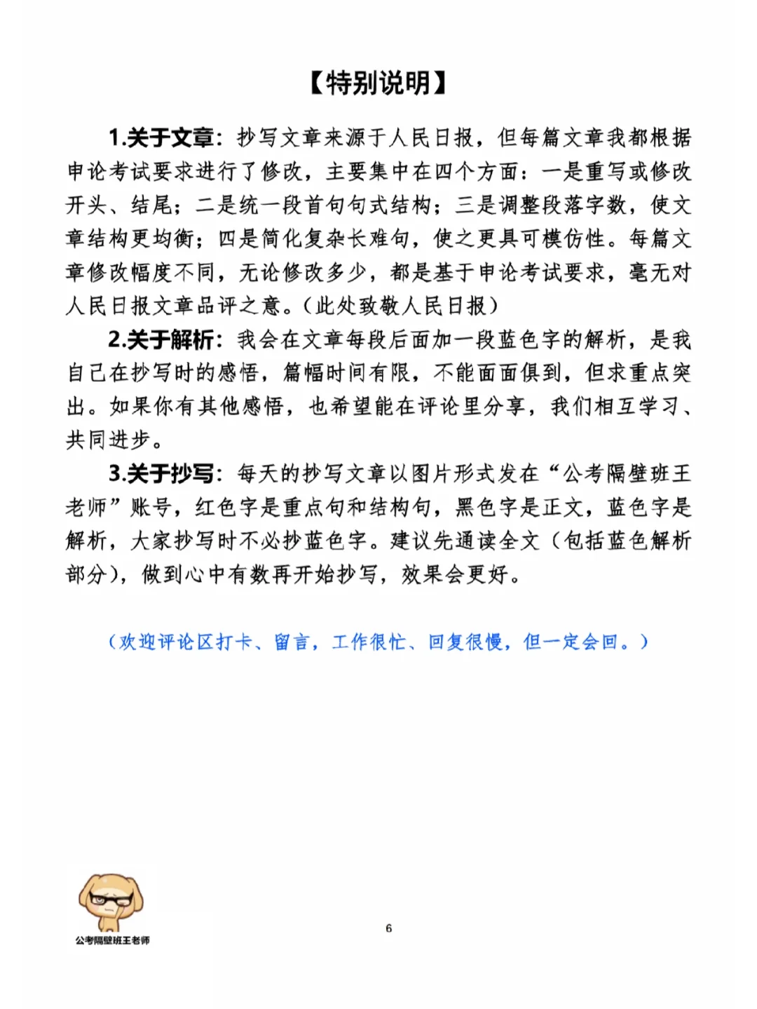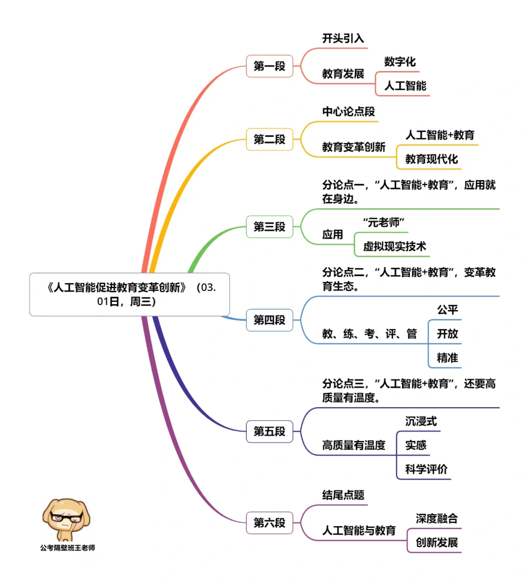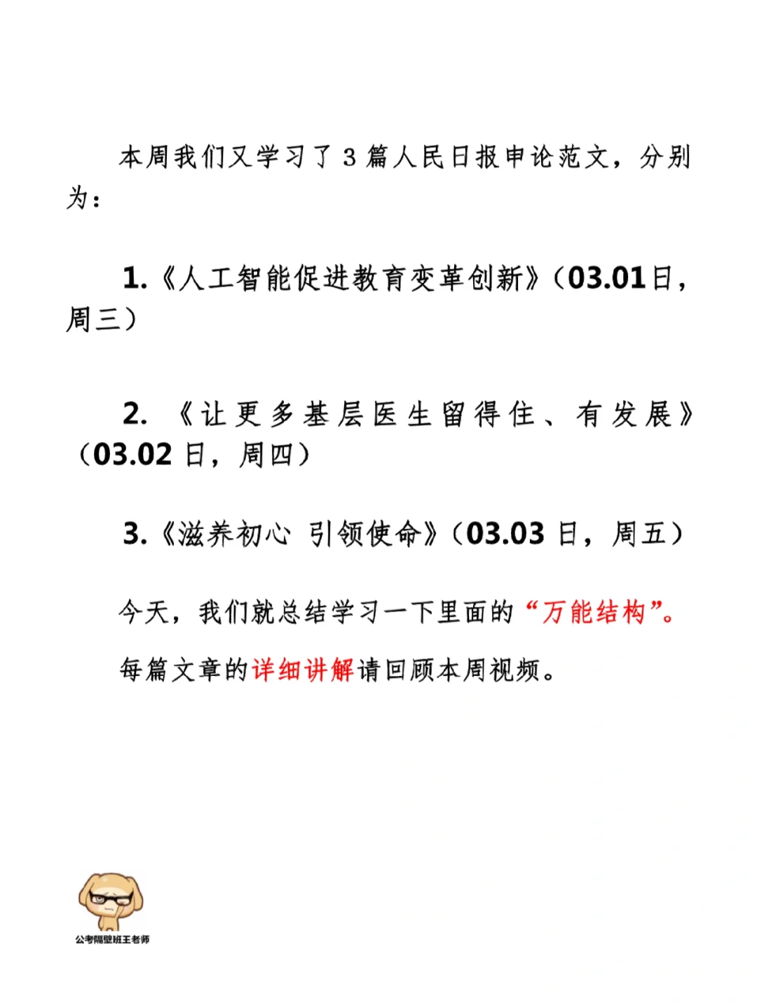 本周我们又学习了3篇人民日报申论范文,分别为: 1.《人工智能促进教育变革创新》(03.01日,周三) 2.《让更多基层医生留得住、有发展》(03.02日,周四) 3.《滋养初心 引领使命》(03.03日,周五) 今天,我们就总结学习一下里面的“万能结构”。 每篇文章的详细讲解请回顾本周视频。 ⭐ ⭐ ⭐ ⭐ ⭐ ⭐ 这里是公考隔壁班王老师独创的“每天半小时・申论80分”抄写团,欢迎加入我们!