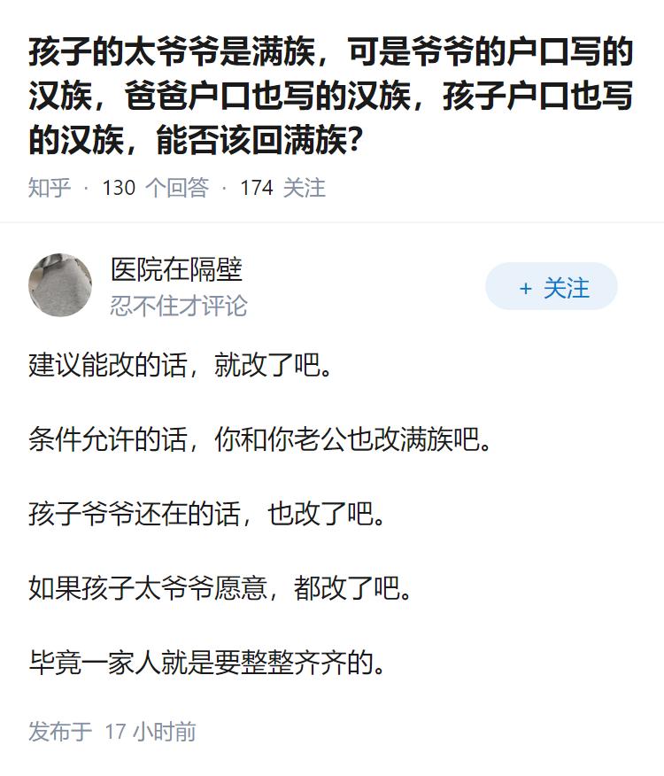 孩子的太爷爷是满族,可是爷爷的户口写的汉族,爸爸户口也写的汉族,孩子户口也写的汉