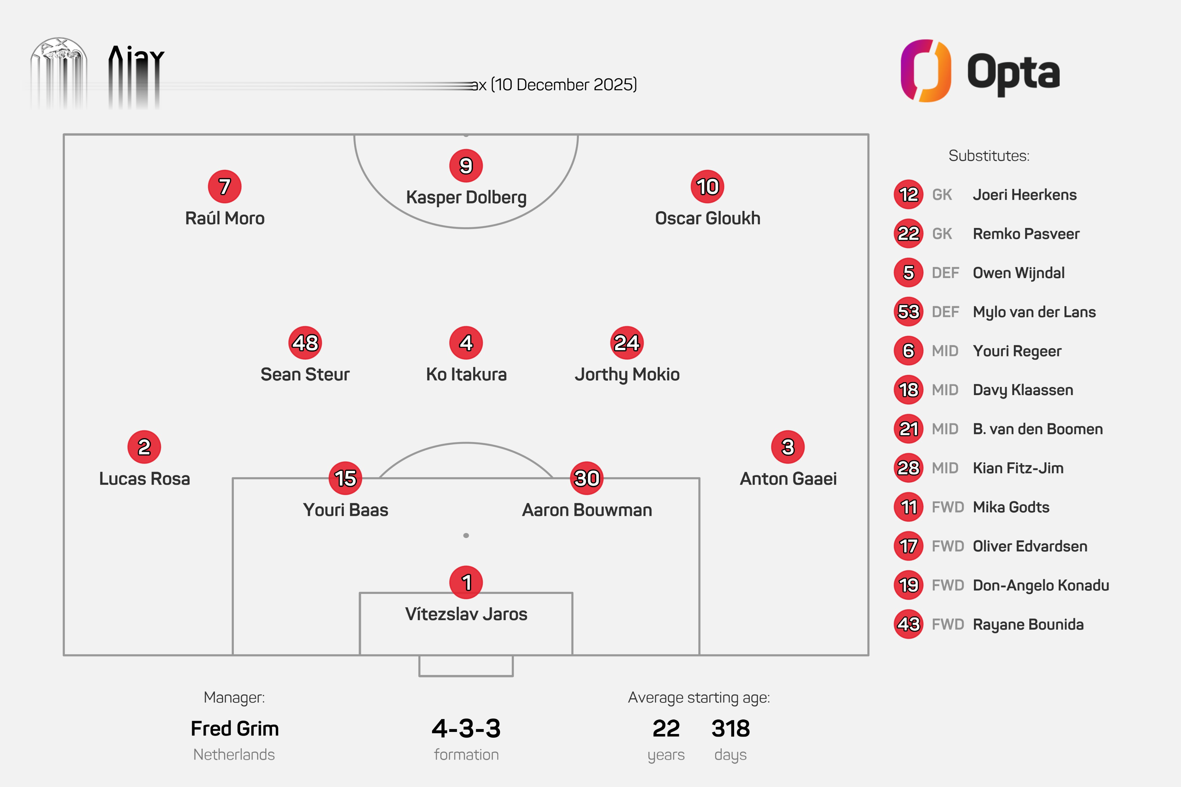 在阿贾克斯的首发阵容中,出现了两名小将:2008年2月29日出生的乔西-莫基奥和2008年1月11日出生的肖恩-施托伊尔。