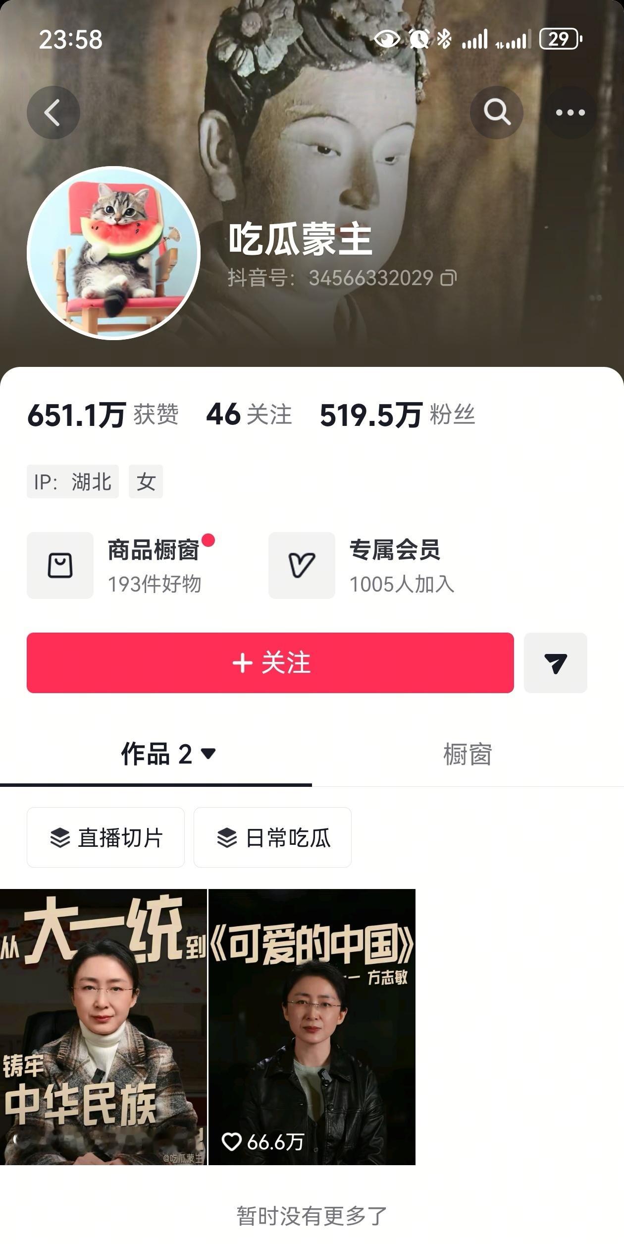 近期,抖音辟谣团队太忙了,《红楼梦》索隐派“悼明论”翻红,关于满清的各种谣传。与此同时,吃瓜蒙主成了很多网友的精神导师,抖音粉丝已突破500万。目前,她已将过往作品隐藏只留下“可爱的中国”、“从大一统到铸牢中华民族共同体意识”两部作品。在吃瓜蒙主看来,所有历史矛盾都能进行非黑即白的单一变量结果论,网友哪怕不懂任何历史知识,也能在她极强的演讲煽动力下进行站队。她把“反清”包装成“反思想殖民”“反帝反封建”,把汉族叙事上升为“被殖民者的集体反抗”,既迎合了部分受众最朴素的民族情绪,又在形式上披上了政治正确的外衣,降低了“极端”心理门槛。