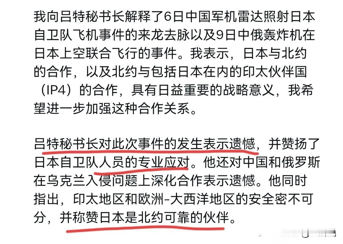 日本真是尴尬!日本防卫大臣小泉进次郎向北约秘书长告状,但是北约秘书长闭口不谈及中国!12月10日,日本防卫大臣小泉进次郎与北约秘书长吕特举行线上会议。虽然日本自己站不住理,小泉进次郎更是被质疑公开说谎,但小泉进次郎还是硬着头皮向北约秘书长吕特通报相关情况,以寻求北约的支持。 先说小泉进次郎,最近动作挺多,又是去冲绳视察,说要部署中程防空导弹,又是在辽宁舰训练的事儿上跟中国较劲,说中国军机用雷达照射了日本战机。 他觉得自己占着理,想在国际上找个靠山帮腔,所以赶紧找北约秘书长吕特开视频会通报情况。但问题在于,他说的这个“理”本身就站不住脚。 中国外交部已经点出来了,日方一会儿说没收到中方通报,一会儿又承认收到了,自己说话前后矛盾。 而且,明明是中国舰艇在公海正常训练,日本战机自己凑过来抵近侦察,这本身就是挑衅,完了还倒打一耙。小泉拿着这么个漏洞百出的事儿去告状,本身就有点硬着头皮上的意思。 再看北约秘书长吕特的反应,那就更有意思了。 他对小泉说的事儿,只是笼统地表示“遗憾”,然后夸了夸日本自卫队人员“专业”。最关键的是,他紧接着就把话题岔开了,开始大谈特谈对“中国和俄罗斯在乌克兰问题上深化合作表示遗憾”,然后夸日本是值得信赖的伙伴,说印太和欧洲-大西洋安全分不开。 看见没?他全程避开了直接评论小泉想说的“中国威胁”,更没顺着日本的意思去指责中国在东海的行为。这可不是偶然,而是北约现在对华态度的一个缩影。 为什么北约秘书长这次这么“怂”,连中国的名字都不敢顺着日本提?原因很简单,被现实教训了,也看清了利害关系。 首先,美国换了特朗普当家,他的心思跟以前那帮人不一样。特朗普对北约本身就没那么多耐心,他更关心的是让欧洲盟友们多交“保护费”,把军费开支提高到GDP的5%。 同时,在贸易等问题上,他对中国也吃过亏。之前打贸易战没占到便宜,中国反制起来一点不含糊,连他自家的生意都受影响。 所以,特朗普政府其实不太想在这个时候主动去激怒中国,甚至直接下令北约峰会公报里不许提“中国”。秘书长吕特是新官上任,自然得看美国的脸色行事。 其次,欧洲盟友们自己也焦头烂额,根本顾不上在亚洲跟中国硬碰硬。俄乌战争打了好几年,俄罗斯是真刀真枪的威胁,坦克导弹可比远在亚洲的“挑战”实在得多。欧洲自己的天然气价格、经济压力就够受了。 再加上特朗普逼着涨军费,德国、法国这些国家跟着美国搞对华“去风险”已经亏了不少钱,哪里还有精力和意愿为了日本去招惹中国?意大利总理甚至明说,要的是“风险管控”,不是“意识形态对抗”。 所以,北约整体上对中国是“战术性装死”,表面不提,但背地里可能搞点小动作。吕特之前还专门向中国保证过,北约是区域性组织,不会向亚洲扩张。他现在要是公开附和小泉指责中国,那不是自己打自己脸吗? 最后看日本自己,它这么积极地向北约靠拢,甚至把战机都派到北约国家去了,根本目的是想“借船出海”。日本一直想突破战后“和平宪法”的限制,成为一个所谓“正常国家”,拥有更强大的军事力量和海外行动能力。 跟北约深度绑定,不仅能获取实战经验、共享情报,还能提升自己的国际政治话语权,让北约成为它在东亚抗衡中俄的靠山。特别是它和俄罗斯还有北方四岛的领土争端,拉上北约就能向俄罗斯施压。 但是,日本的想法是一回事,北约买不买账是另一回事。在北约眼里,日本现在更大的价值可能是用来牵制俄罗斯,填补它在东欧方向的部分压力,而不是让它把自己拖进和中国的直接对抗中。 所以,吕特对小泉的回应非常“官方”和“套路”:赞扬你是好伙伴,强调我们安全相连(意思是你要多出力帮我),但对你想让我替你出头对付中国这个核心诉求,装傻充愣,顾左右而言他。 整件事看下来就是:小泉进次郎想拉大旗作虎皮,利用北约来给自己在东亚的强硬立场撑腰。但北约秘书长吕特心里跟明镜似的,现在招惹中国成本太高、收益不明,自家还有一堆烂摊子,美国老大也不支持。 于是他就玩了一手“太极拳”,对日本表示同情和鼓励,但坚决不接“中国”这个话头,反而把话题引到俄罗斯和乌克兰上去。这等于委婉地告诉日本:帮你对付俄罗斯可以聊聊,但对付中国?免谈。 日本这下就尴尬了,热脸贴了个冷屁股,自己的小算盘被看得透透的,想靠外部力量给自己壮胆、突破军事限制的企图,在国际现实面前碰了个软钉子。这也说明,在当今大国博弈的棋盘上,没有谁是真傻,利益算计才是硬道理。