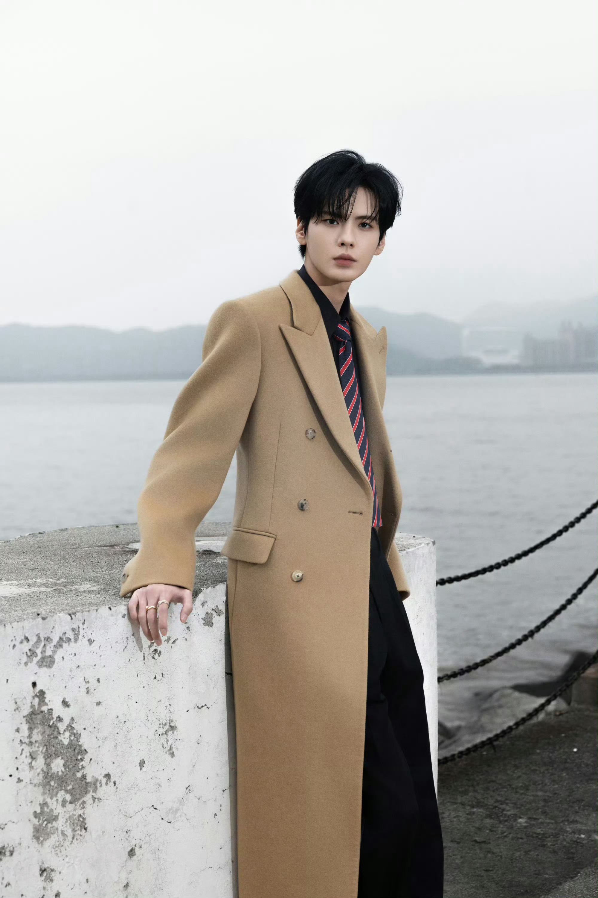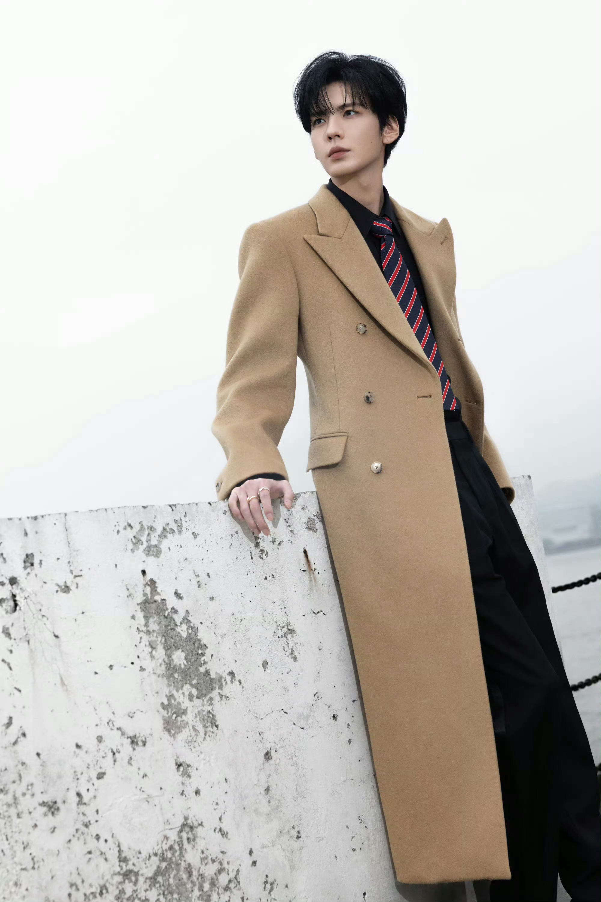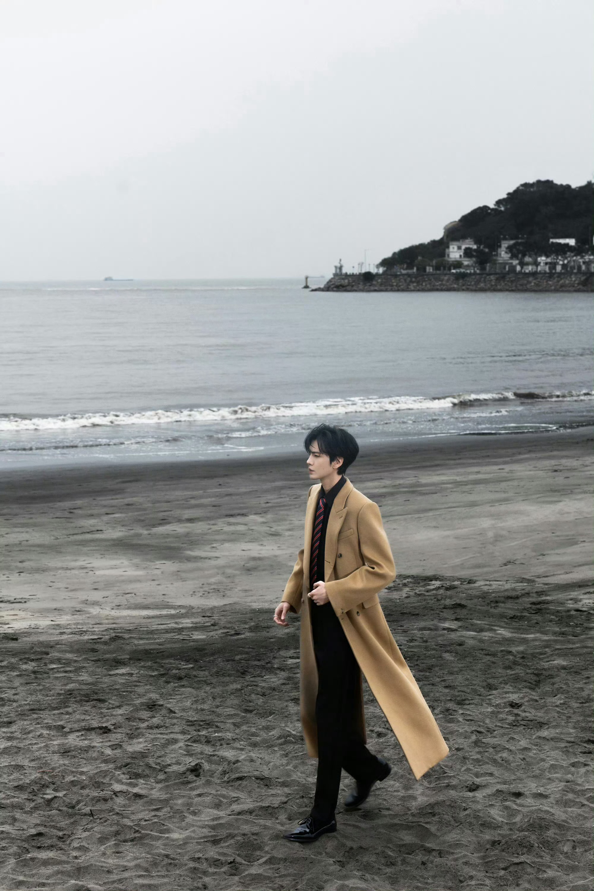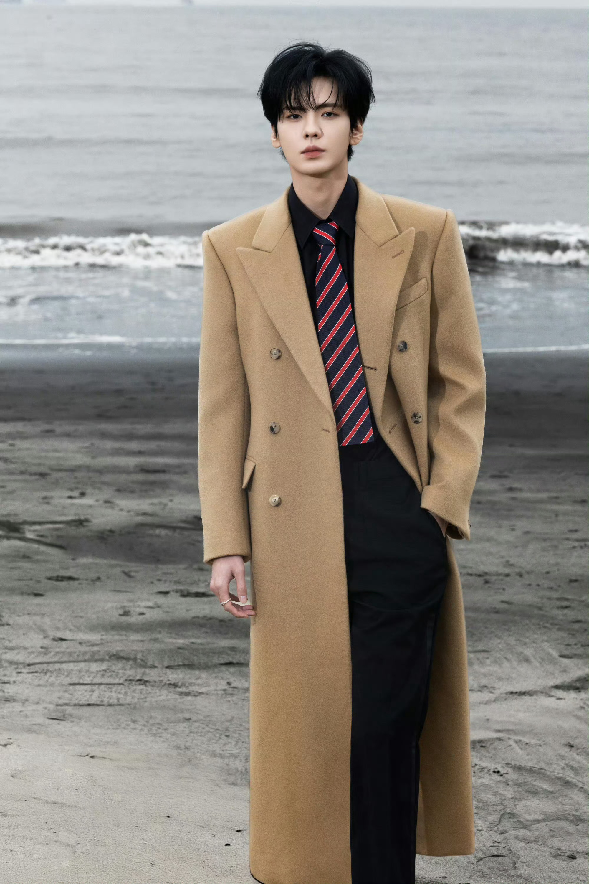 毕雯珺帅得我有心事了请毕雯珺把大衣焊在身上,卡其色大衣在海边真的很有韩剧男主那味