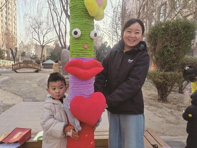 志愿者与老师穿梭其间提供协助,并提醒安全事项,孩子们踮着脚、举起装饰,家长们配合调整位置,原本单调的树干渐渐被色彩与童趣包裹,成为小区里的“创意景观”。中班的刘泇璐小朋友兴奋地说“我给树木挂上了自己画的太阳挂饰,希望大树冬天也能暖暖的。”家长刘颖说:“这样的亲子活动很有创意,既能引导孩子通过努力美化环境,又能带来成就感和快乐,是一段宝贵的亲子时光。”活动现场充满欢声笑语,这些柔软的毛线里缠绕的不仅是包裹起来的温度,更是孩子们对自然生命最质朴的关爱。