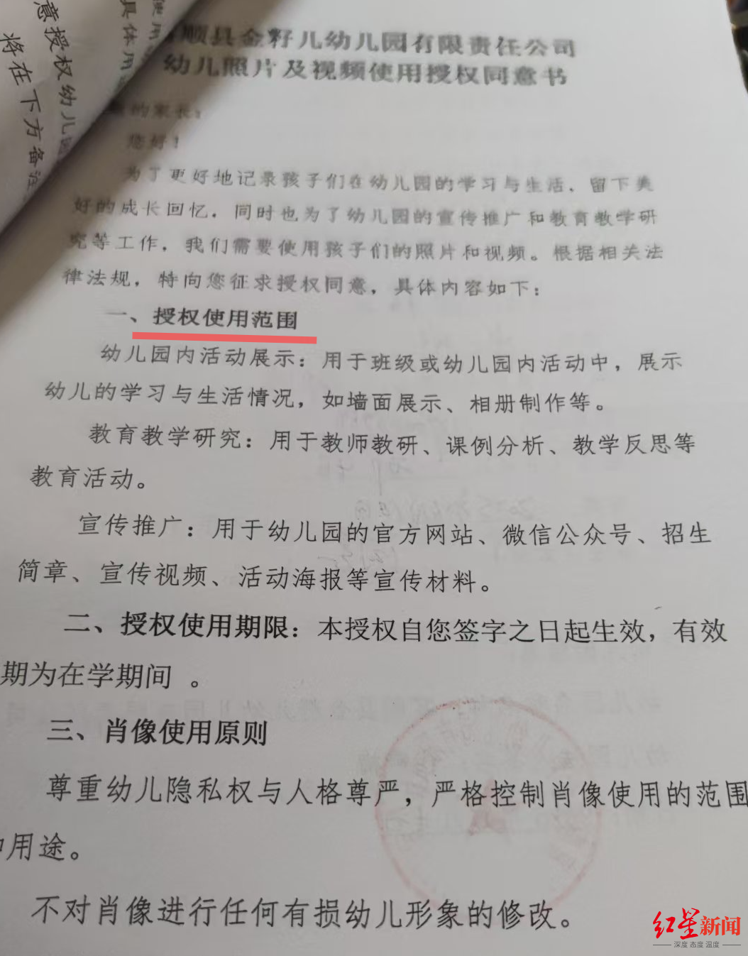 红星新闻记者从谢老师出示的一叠印有“幼儿照片及视频使用授权同意书”的纸质资料中看到,其中注明了“授权使用范围”,包括幼儿园内活动展示、教育教学研究、宣传推广等内容,签订时间为今年6月。