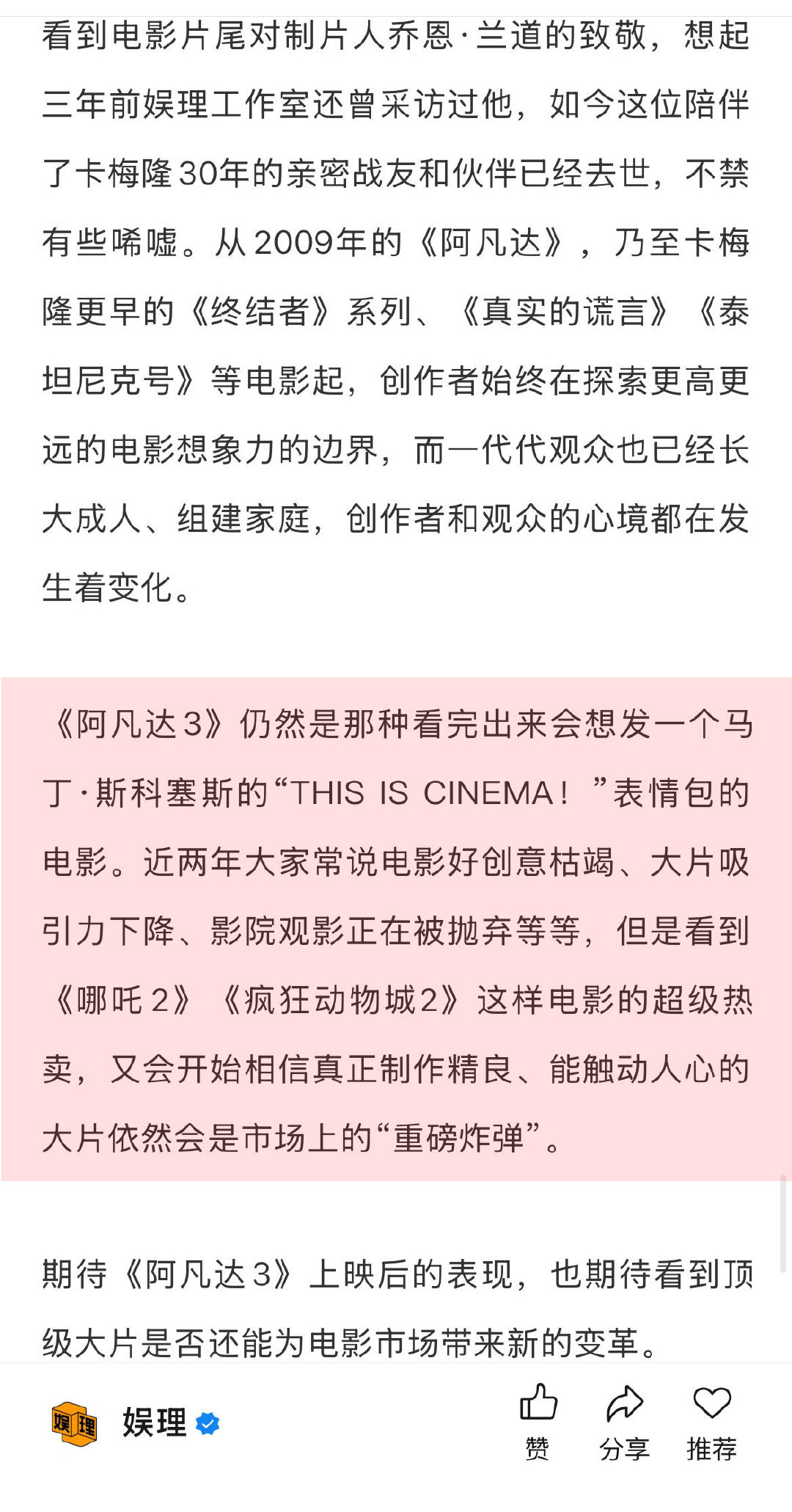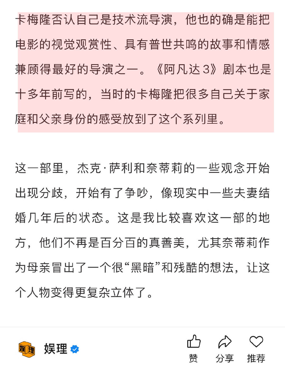 阿凡达3还能爆吗 阿凡达3很重视中国票房 从剧情方面来看,《阿凡达3》片长达到了3小时15分钟之长,不过好在这部里大部分角色、生物、人物关系都是延续自上一部,不用再花费很多篇幅介绍引入他们,所以并不感觉漫长。整部电影依然是三幕剧结构,第一幕展现杰克奈蒂莉一家在失去长子的阴影下如何回归生活,第二幕讲述一家人踏上旅途和冒险,同时反派也在行动,第三幕是大决战…娱理独家↓