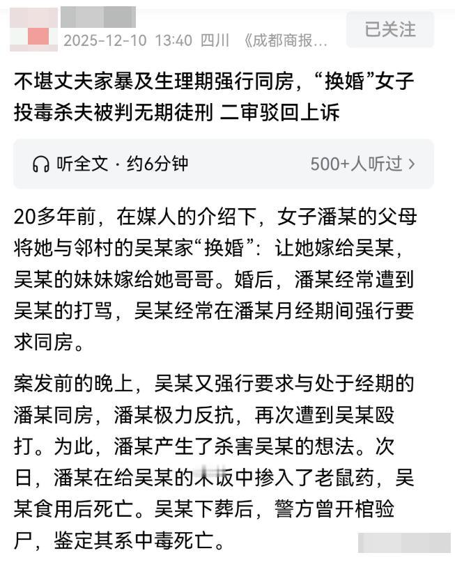 江西鹰潭,丈夫不顾妻子生理期,欲强行跟妻子发生关系,妻子反抗,却被男子殴打,次日早晨,女子为丈夫做了一锅饭,里面加了毒鼠强,男子吃完后身亡,女子潜逃27年,抓捕归案后,女子因故意杀人罪被判无期徒刑,女子不服,提起上诉,二审让她失望至极。[嘘] 1997年夏天,江西鹰潭的一个村庄里,一起死亡事件打破了平静,起初人们以为是中暑,匆忙下葬后,亲属们却觉得不对劲,报警后检验发现,死者是中毒身亡,而他那二十四岁的妻子潘某,已经不见了踪影,这一走,就是二十七年。 时间倒回一年前,一九九六年,潘某嫁给了吴某,这不是自由恋爱,而是一桩“换亲”潘某嫁给吴某,吴某的妹妹则嫁给潘某的三哥,两个陌生年轻人就这样被安排在了一起,成了夫妻。 婚后的日子,与潘某想象的完全不同,丈夫吴某脾气不好,喜欢打牌,更重要的是,他对待妻子的方式简单粗暴,争吵和动手成了家常便饭,甚至在潘某身体不适的特殊时期,他也毫不体谅,稍有不从便是拳脚相加。 这种充满恐惧的生活持续了一年多,潘某试过忍耐,但情况并没有改变,1997年7月26日,从田里干活到晚上回家,她又因为一些小事被丈夫责骂殴打,那天深夜,冲突再次升级。 第二天早上,潘某像往常一样准备了早饭,丈夫吃完后下地干活,不久便感到强烈不适,最终没能救回来,当家人发现潘某不见时,才将两件事联系起来,她踏上了漫长的逃亡路,在外地隐姓埋名,重新组建了家庭,生儿育女。 直到今年七月,警方终于找到了她,27年的逃亡画上了句号,但故事并没有结束,法庭上,这起陈年旧案的全部细节被重新审视。 法官面临的是一个复杂的局面,潘某的行为确实造成了他人死亡,构成严重犯罪,但这段婚姻的背景特殊,是典型的包办婚姻,两人几乎没有感情基础,在婚姻期间,潘某长期遭受家庭暴力,案发前夜的情况尤其严重。 这些都被法庭视为导致她犯罪的重要因素,然而她作案后选择逃亡而非自首,这也影响了最终的量刑,一审判决她无期徒刑,同时需要对被害人家属进行经济赔偿。 看完这个发生在江西鹰潭、跨越了27年的悲剧,心里真是堵得慌。 “用女儿的幸福去换儿子的婚姻,本身就是把女儿当成了商品。” “这不仅是对身体的伤害,更是对人格尊严的彻底践踏。那种恐惧和绝望,外人很难真正体会。” “她也是受害者啊!在那个年代,一个农村妇女,遭受家暴能向谁求助?村委会?妇联?还是跑回那个用她换了媳妇的娘家?” “同情她的遭遇,但绝不能认同她的手段,以暴制暴,私自剥夺他人生命,这是对法律底线的挑战。” “法律维护的是最基本的秩序,今天我们可以同情潘某,但如果开了这个口子,明天会不会有人效仿?” “现在至少有报警、申请人身安全保护令这些途径,社会对家暴也是零容忍的态度。” 从这个发生在二十多年前的悲剧里,你觉得对于今天我们处理家庭矛盾、应对亲密关系中的冲突,最重要的启示是什么?欢迎在评论区留下你的观点,每一个理性的讨论,都是避免悲剧重演的一分力量。 信息来源:央视新闻
