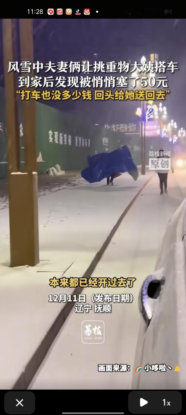 12月10日,辽宁抚顺。女子晒视频称,下雪天开车遇到一位大姨挑着重物,不知要走到什么时候,丈夫见状后掉头回去让大姨上车。 当事人刘女士在评论区表示,因为大姨的东西后备箱放不下,丈夫就把后座放倒,到家整理后座时发现大姨偷偷在车里留了50多块,明天下班回家留一下大姨还给她