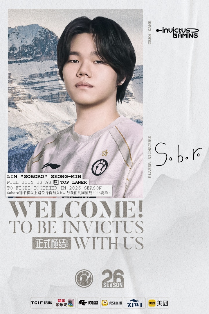 青春无畏,極境并肩,热烈欢迎上路选手Soboro加入iG电子竞技俱乐部,目前俱乐部正积极配合联盟进行注册流程,希望属于iG的热血基因,会因你的加入而更加奔涌沸腾。