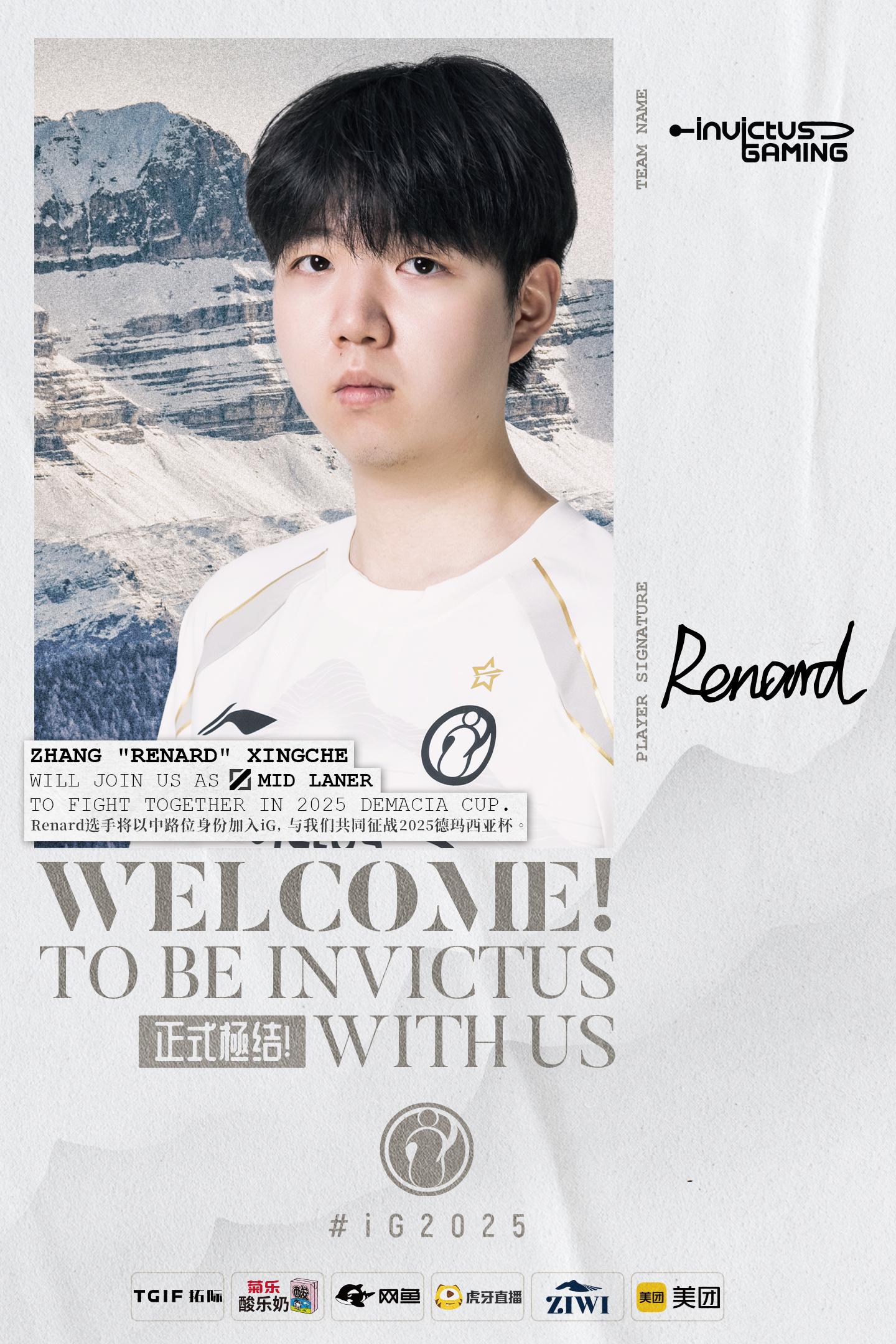 青矜炽焰,踏云擎锋,热烈欢迎中路选手Renard加入iG电子竞技俱乐部,目前俱乐部正积极配合联盟进行注册流程,期待与你共同为iG的荣誉而战。