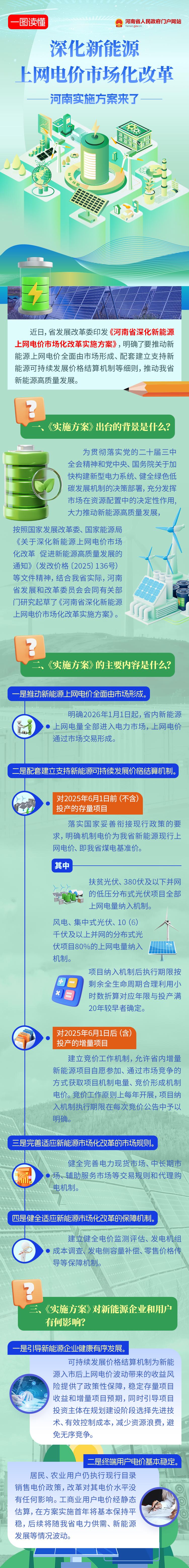 近日,省发展改革委印发《河南省深化新能源上网电价市场化改革实施方案》(以下简称《实施方案》),明确自2026年1月1日起,全省新能源(风电、光伏)上网电量全部进入电力市场,上网电价通过市场交易形成。