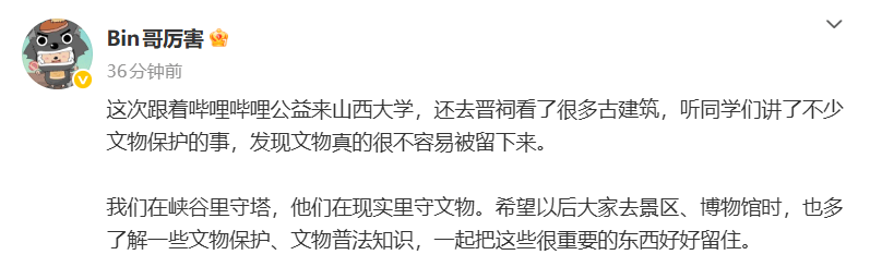 我们在峡谷里守塔,他们在现实里守文物。希望以后大家去景区、博物馆时,也多了解一些文物保护、文物普法知识,一起把这些很重要的东西好好留住。