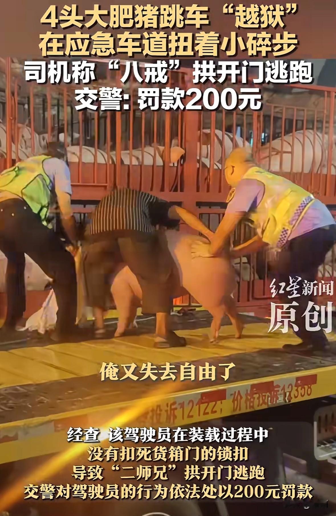 四川峨汉高速上,几头大肥猪在应急车道“溜达”,看着挺滑稽。 是货车司机王某没检查货箱扣锁,4头猪顶开锁扣跳了车。后来民警和工作人员一起把猪抓回装车,王某被罚了200块。 网友都调侃这是猪“越狱”,还有人说猪都知道走应急车道。 笑归笑,这事其实挺危险。高速上车速快,掉出来的猪随时可能引发车祸,不光司机要赔钱,还会害了别人。 《道路交通安全法》早有规定,载物得符合要求,车厢没关好就开车本来就违法。 货运司机拉货真得上点心,多检查一下锁扣、车厢,别嫌麻烦。有时候不起眼的小疏忽,可能酿成大事故。 你遇到过类似的路面突发情况吗?