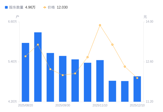 日期A股户数(户)流通A股户均持股数(股)户均持股市值(万元)2025-12-10496369351.2411.252025-11-28482069628.6411.972025-11-20482959610.9012.692025-11-10544898518.3911.822025-10-31536898645.3111.032025-10-20547128483.6710.342025-09-30557428326.9010.102025-09-19566188198.0710.122025-09-10628177389.069.752025-08-20596547780.849.95