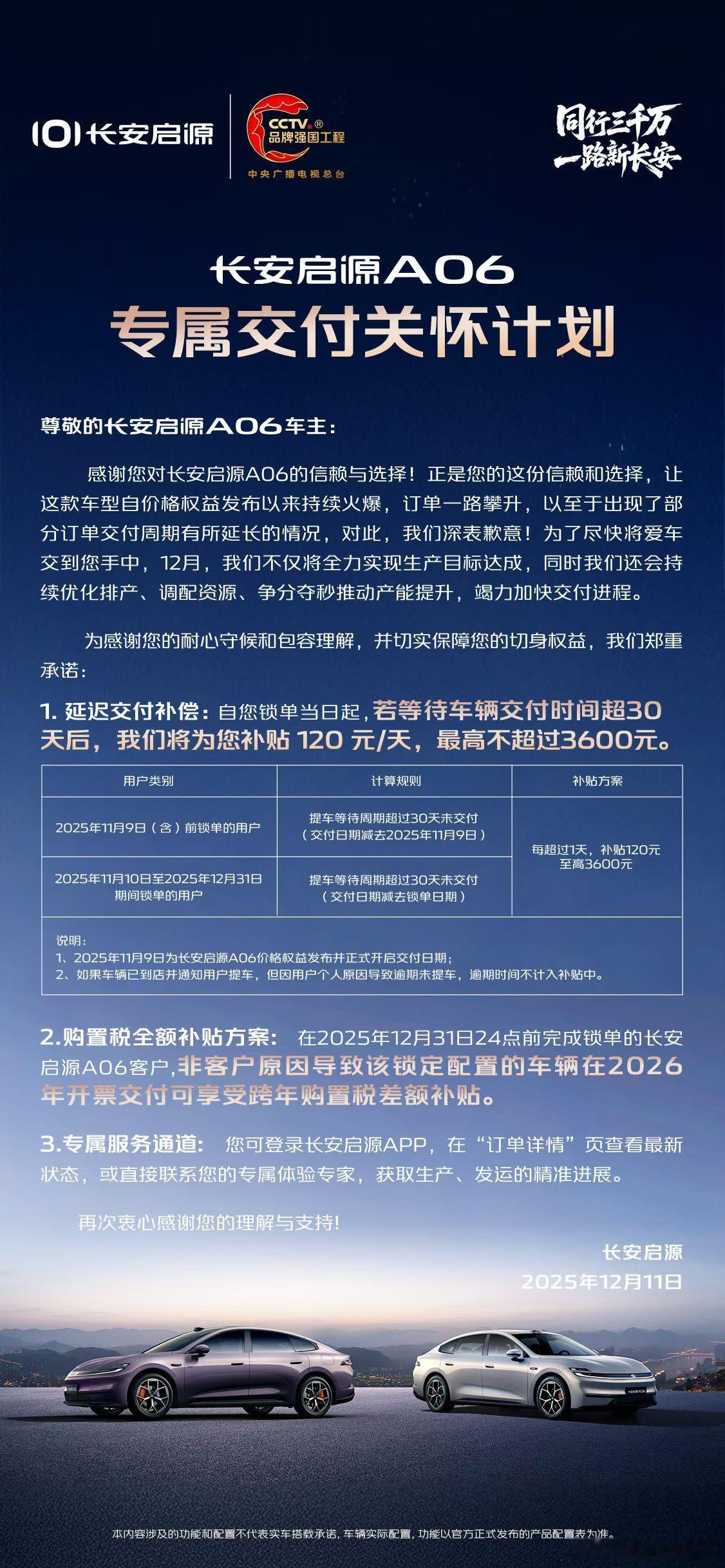 长安启源为回应信赖与期待,正式启动「专属交付关怀计划」同行三千万,一路新长安!长