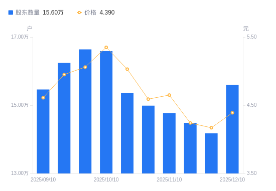 日期A股户数(户)流通A股户均持股数(股)户均持股市值(万元)2025-12-101559848578.653.772025-11-281417509440.093.942025-11-201448539237.873.922025-11-101477359057.664.212025-10-311498758928.334.102025-10-201535808712.944.382025-10-101658707867.594.212025-09-301663907843.003.972025-09-191624408033.723.982025-09-101546488438.503.89