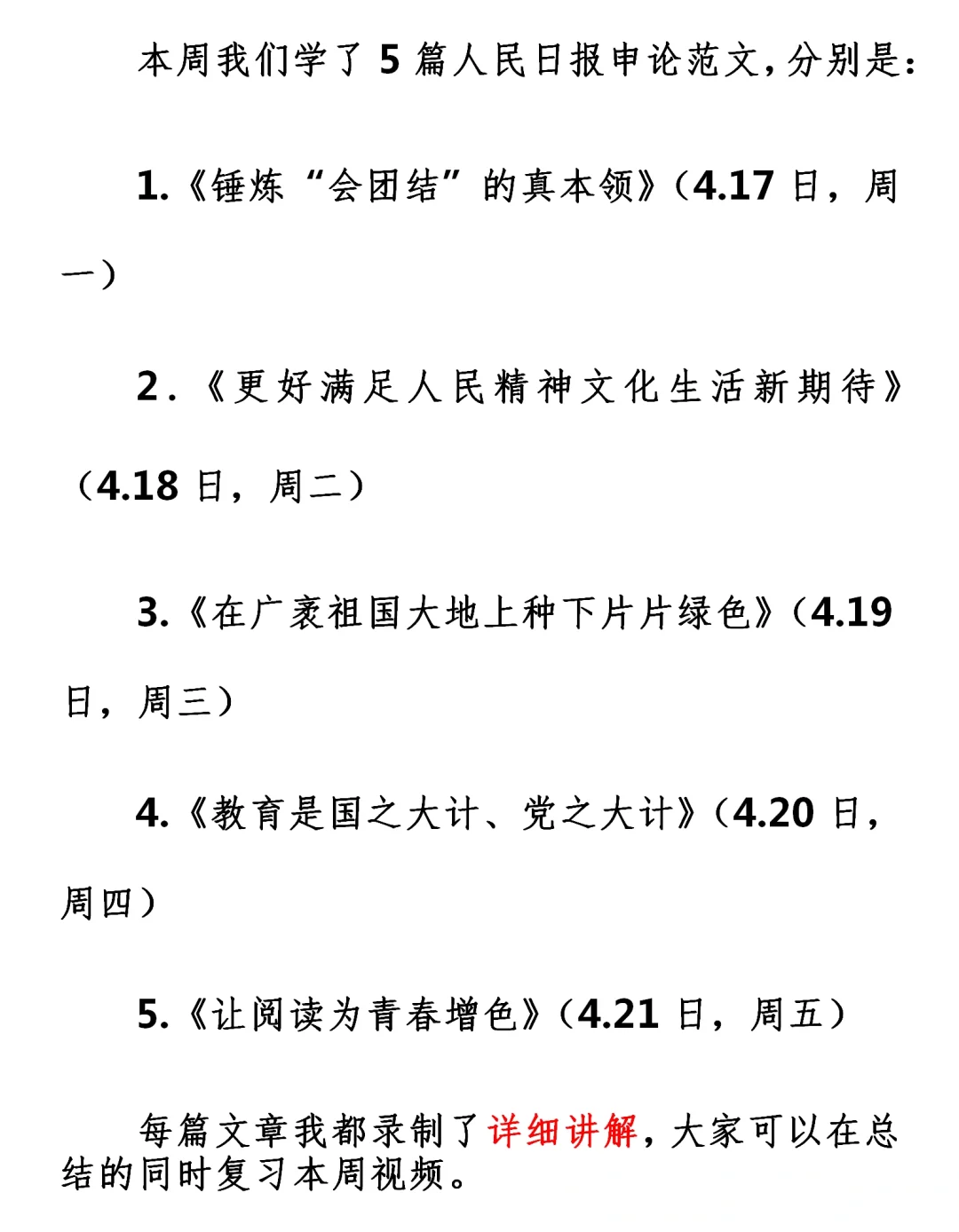 今天我们积累申论素材、必背金句和重点知识。它们来自于一周以来,我们学习的5篇人民日报申论范文,分别是: