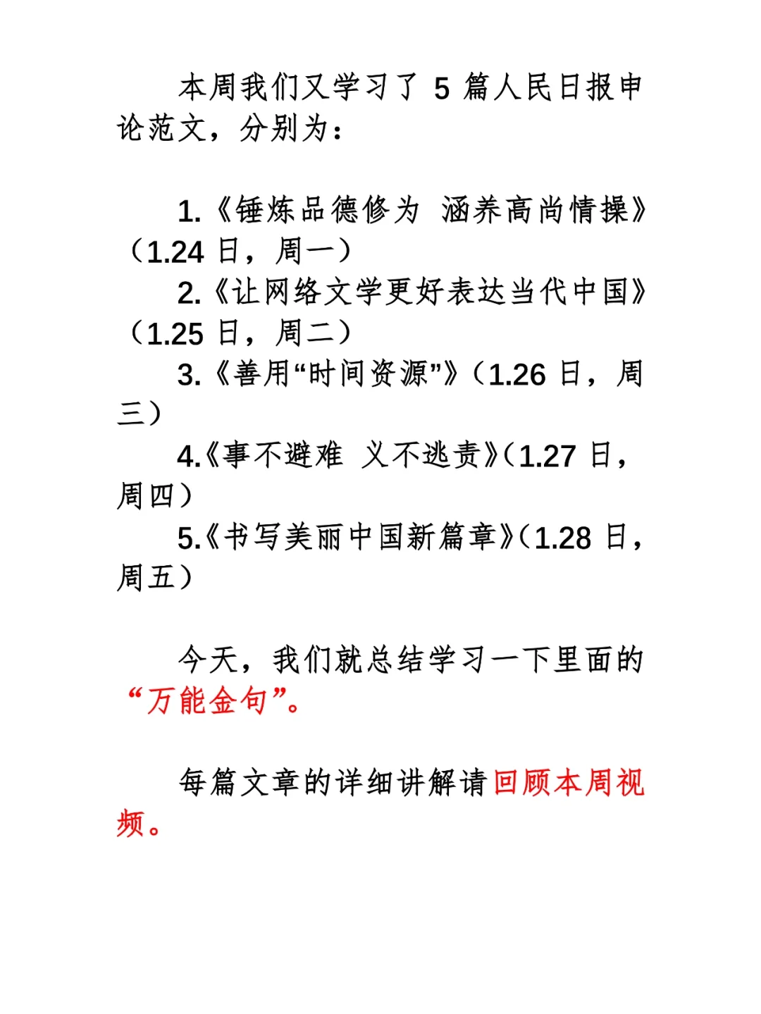 今天我们积累申论素材、必背金句和重点知识。它们来自于一周以来,我们学习的五篇人民日报申论范文,分别是: