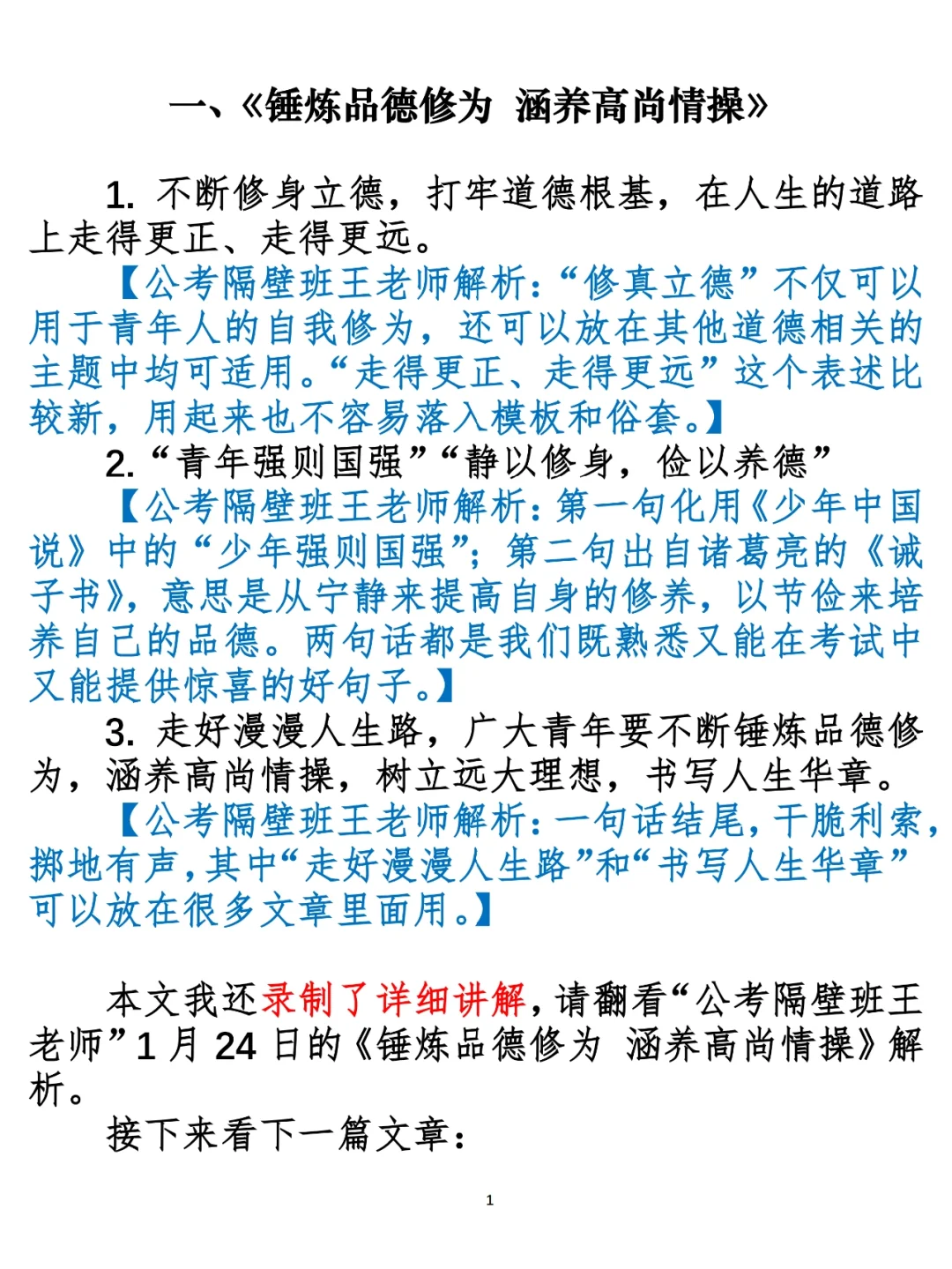 1.《锤炼品德修为 涵养高尚情操》(1.24日,周一)