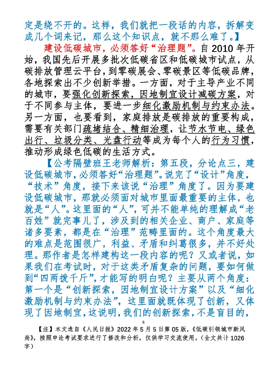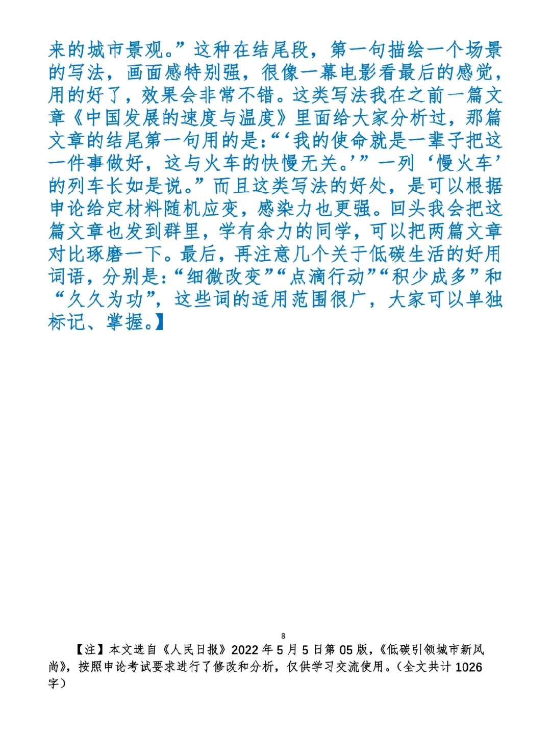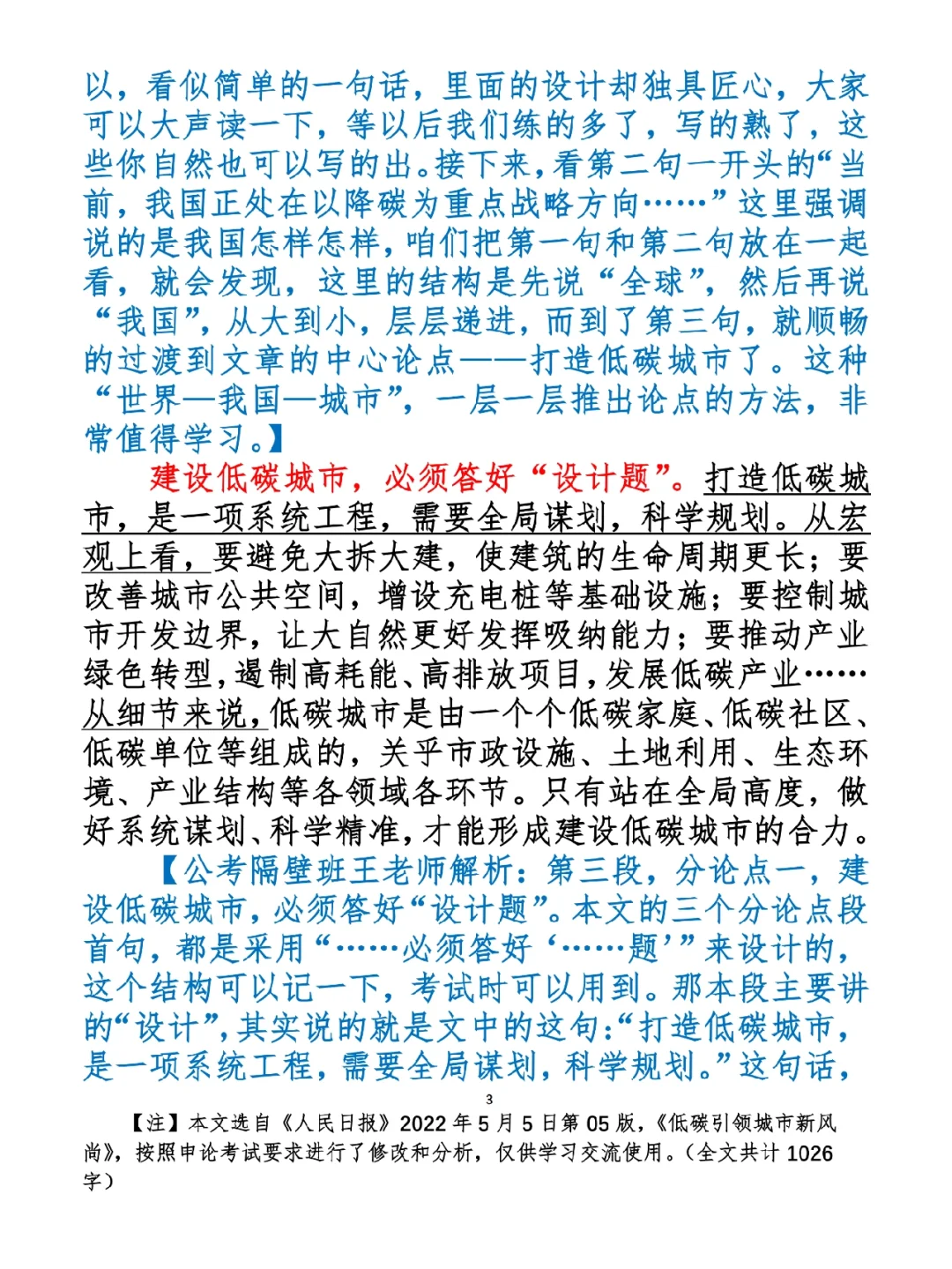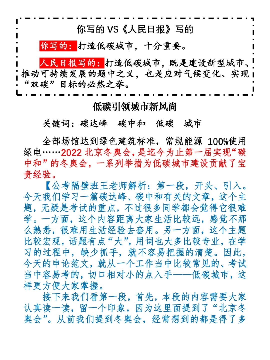 1.如何抄写:每天的抄写文章以图片形式发在“公考隔壁班王老师”账号,红色字是重点句和结构句,黑色字是正文,蓝色字是解析,大家抄写时不必抄蓝色字。建议先通读全文(包括蓝色解析部分),做到心中有数再开始抄写,效果会更好。 2.关于文章:抄写文章来源于人民日报,但每篇文章我都根据申论考试要求进行了修改,主要集中在四个方面:一是重写或修改开头、结尾;二是统一段首句句式结构;三是调整段落字数,使文章结构更均衡;四是简化复杂长难句,使之更具可模仿性。每篇文章修改幅度不同,无论修改多少,都是基于申论考试要求,毫无对人民日报文章品评之意。(此处致敬人民日报) 3.关于解析:我会在文章每段后面加一段蓝色字的解析,是我自己在抄写时的感悟,篇幅时间有限,不能面面俱到,但求重点突出。如果你有其他感悟,也希望能在评论里分享,我们相互学习、共同进步。 ⭐️ ⭐️ ⭐️ ⭐️ ⭐️ ⭐️ 这里是公考隔壁班王老师独创的“每天半小时 申论80分”抄写团,欢迎加入我们!