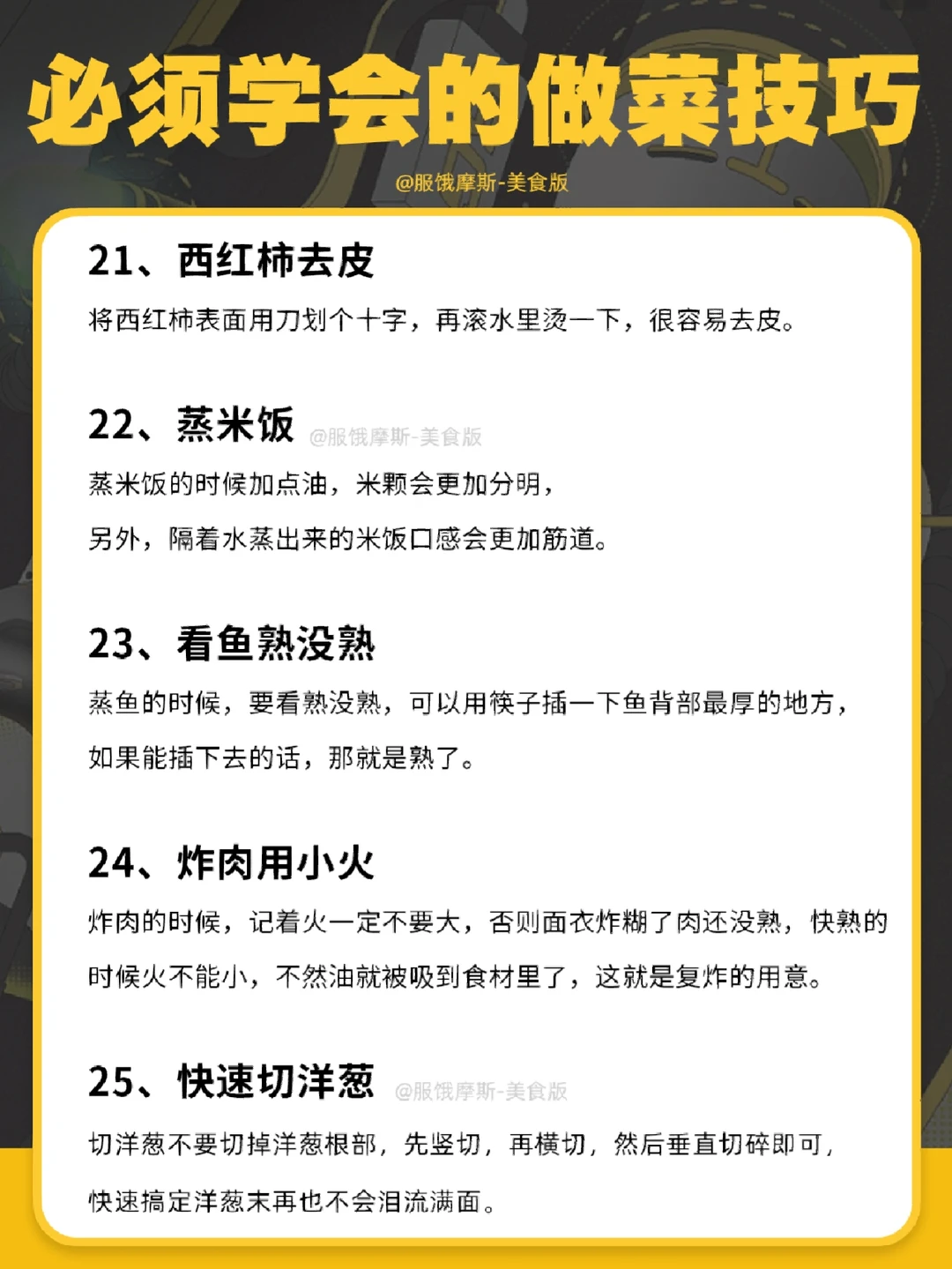 25个超级实用的做菜技巧 主页还有更多做菜技巧和方法哟 也有家庭版火锅和烤肉的食材清单等 -