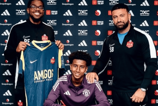在签约纪念照中,他身着10号球衣,与两名来自西伦敦这家足球学院的教练合影留念。接下来,他将加入曼联U14梯队。