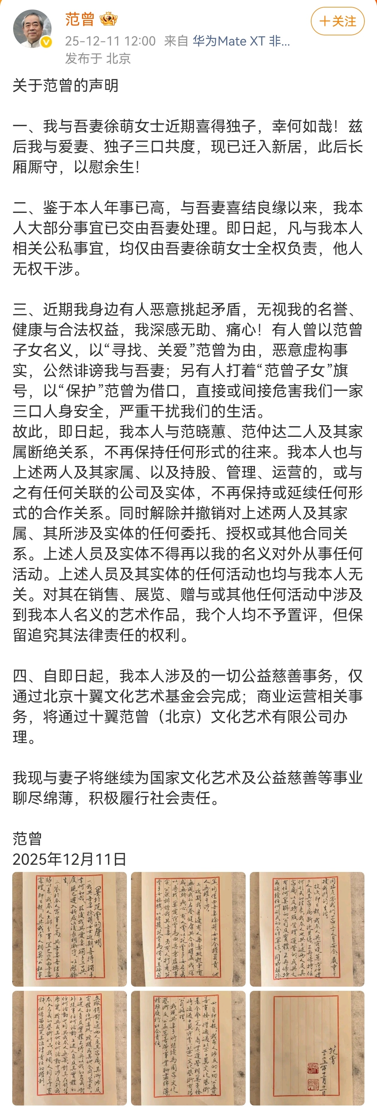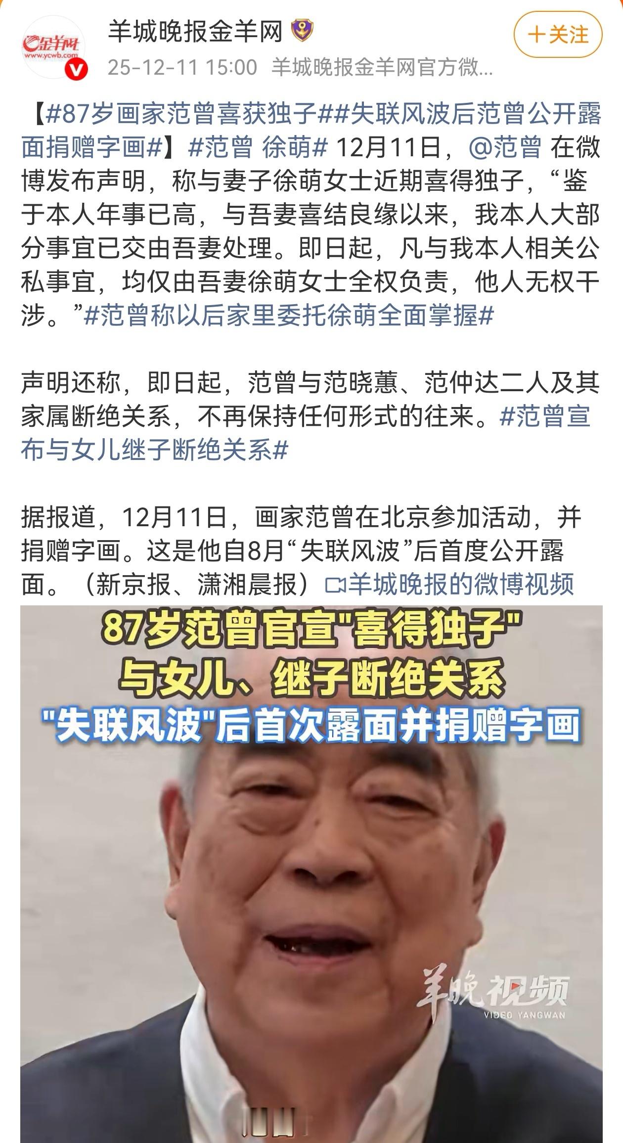 12月11日,87岁书画家范曾公开发布手书声明,确认与第四任妻子、37岁的徐萌“近期喜得独子”,并高调宣布与亲生女儿范晓蕙、继子范仲达及其家属“断绝关系”,将所有公私事务交由徐萌全权打理。87岁画家范曾喜获独子范曾宣布与女儿继子断绝关系范曾共有4段婚姻,与徐萌相差50岁,2024年4月再婚,此前育有一女范晓蕙,及两位继子范一夫、范仲达。2025年8月,范晓蕙公开称父亲被徐萌带离住所后“失联”,住所贴封、藏品被搬,引爆家族内斗猜测。范曾与徐萌年龄相差50岁,居然还能老来得子,最好做一下亲子鉴定,范曾单方面与女儿继子断绝关系,并不具有法律效力,子女仍负有赡养义务且享有继承权。从范曾对恩师沈从文的背叛,就能看出范曾的人品如何。1962年,25岁的中央美院毕业生范曾,为谋得理想工作,连续给在中国历史博物馆任职的沈从文写信,表达“崇仰之情”,甚至凌晨敲门说“梦见先生生病,连夜从天津赶来”。随后,沈从文将其调入博物馆并倾心提携。让沈从文没想到的是,自己被打成“反动权威”后,范曾居然在批斗中写大字报,罗列“几百条”罪状,甚至当众羞辱恩师,甚至专挑沈从文最在意的学术、人格尊严下手,用“黄色小说”“脓包烂透”等恶毒语言,精准戳痛处,可见其人情寡淡、手段凌厉。再看范曾的绘画作品,主打“连环画式复制粘贴”,与其在人际关系中的功利人格一样,都是追求快速变现、最大化收益。 87岁画家范曾喜获独子